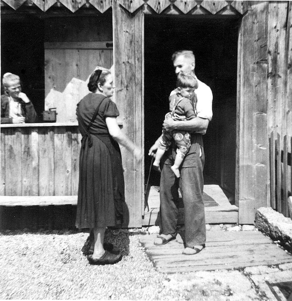 • Pers. v. li.: Gast; Moosbrugger Mathilde (Sohn Mathias); Broger Rudolf (1914-1995) mit Sohn Rudolf (1957-) auf dem Arm