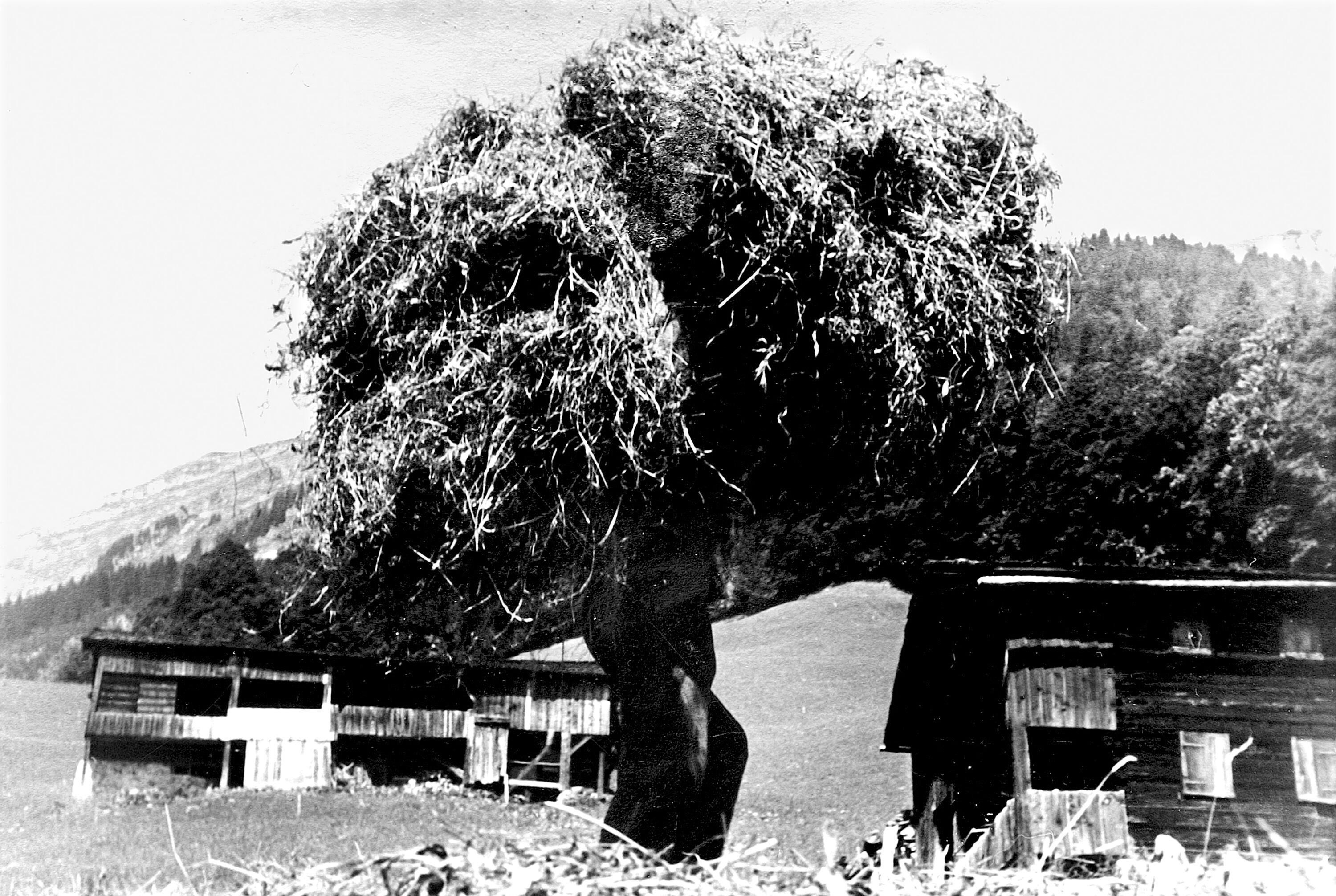 • Berbig Josef als Heuträger; Hütten: Muxel Michael links; re. Moosbrugger Oskar