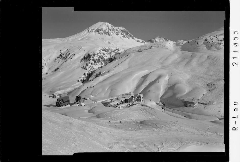 [Hotel Zürserhof bei Zürs am Arlberg mit Rüfispitze und Krabachspitze]