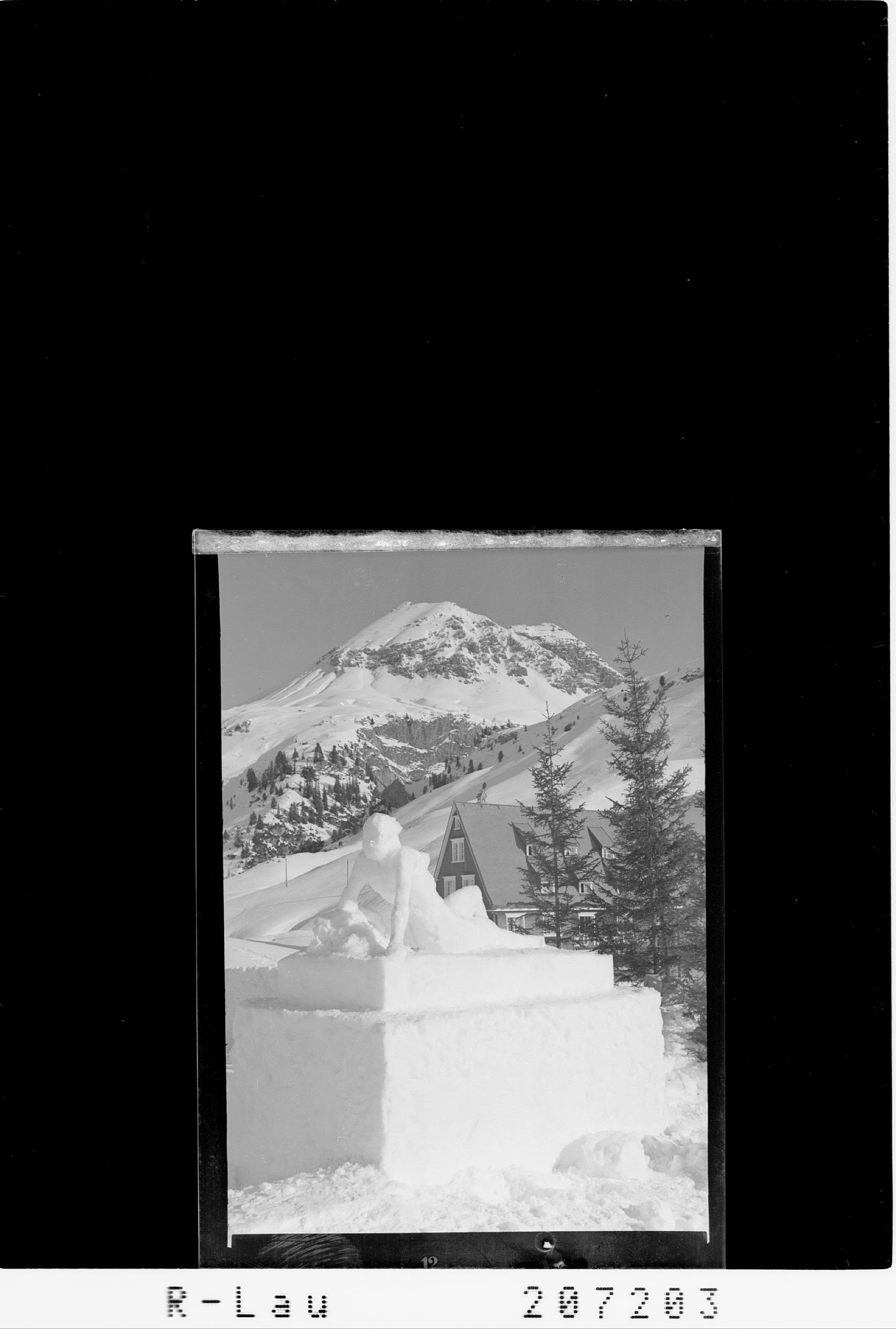 [Schneeskulptur beim Hotel Zürserhof in Zürs am Arlberg mit Blick zur Rüfispitze]