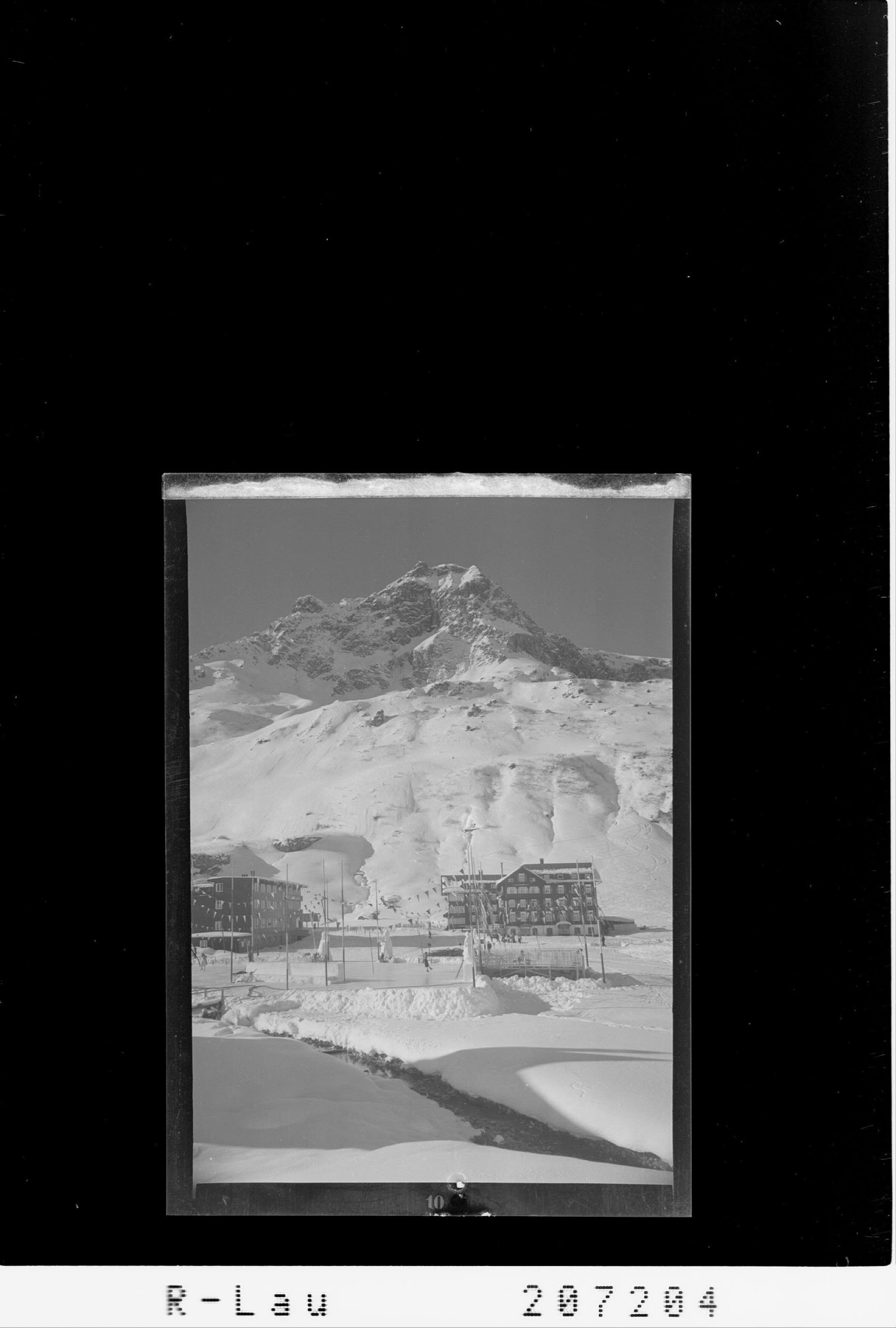 [Eislaufplatz und Hotel Edelweiss in Zürs am Arlberg mit Blick zur Hasenfluh]
