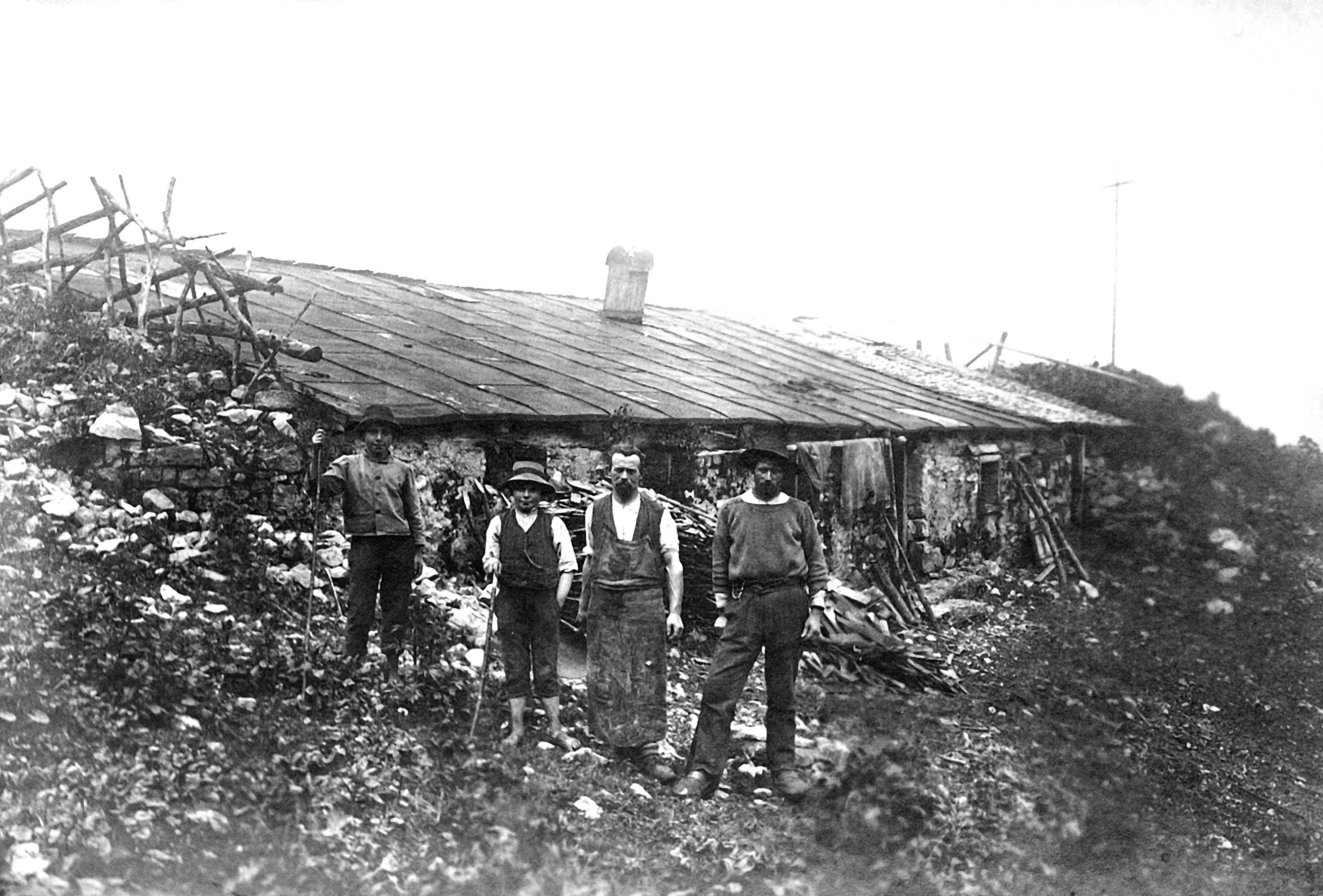 • Vor der Alphütte Bühlen stehen v. li.: Felder Franz (1906-1995); Felder Alois (1905-1982); unbekannt; Feurstein Anton (1878-1923); Bild um 1915/17