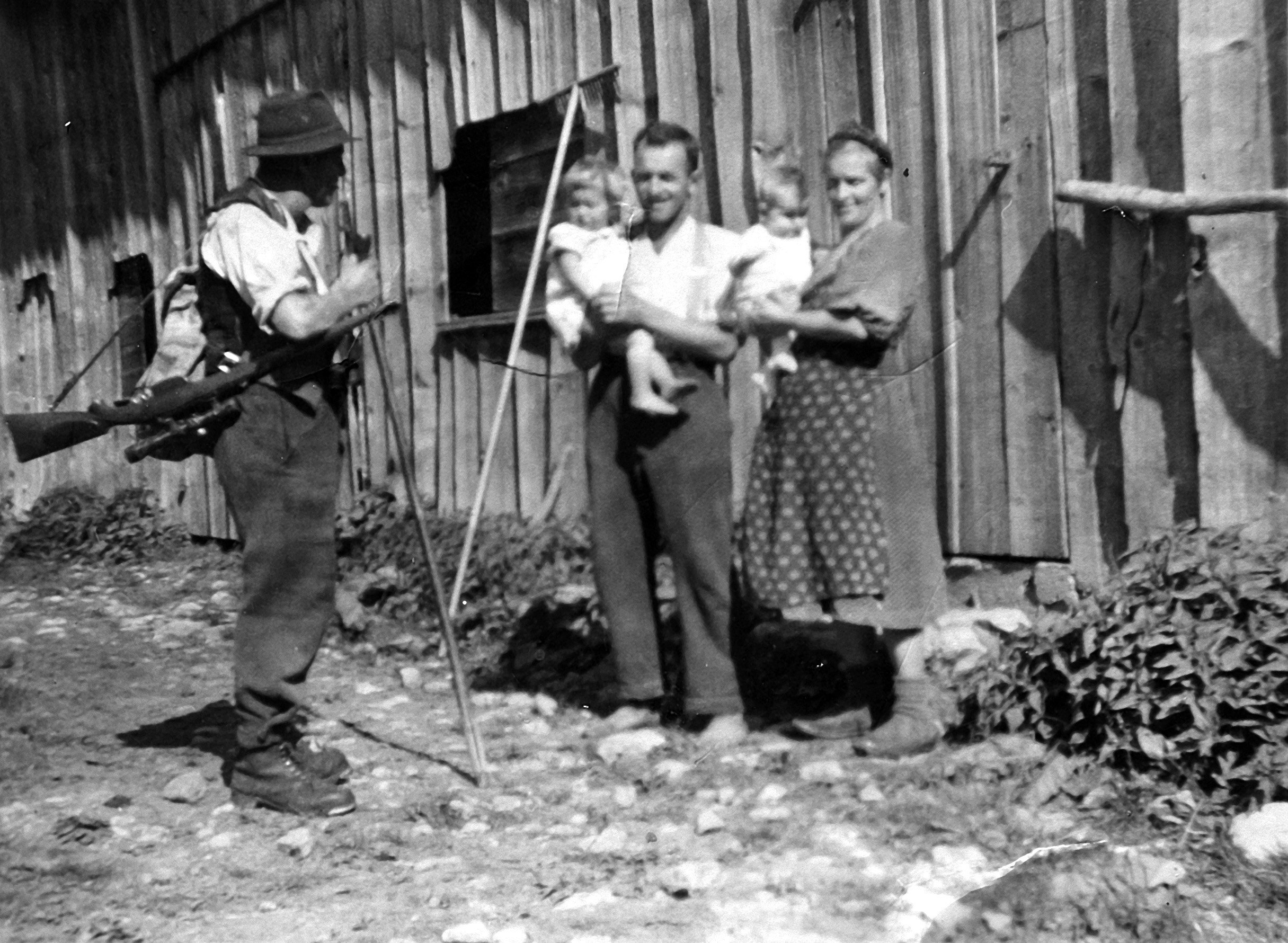 • Vor der Alphütte Finnisgründ v. li.: Jäger Rusch aus Andelsbuch; Fink, Maria (1941-, verh. Metzler); Fink, Johann Josef (1910-1991); Fink, Jodok (1943-); Fink, Barbara