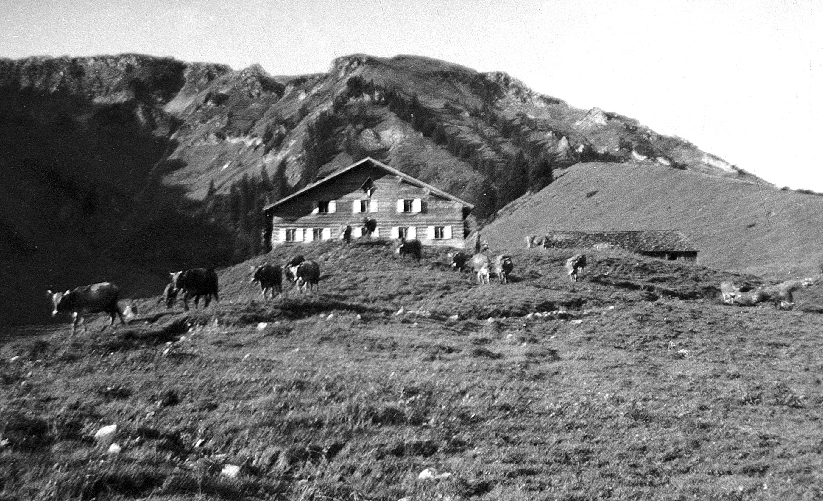 • Der Hügel rechts ist der "Schetteregger Boden"; rechts das Hüttendach war der Saustall und noch früher die oberste Vorsäßhütte "Grüßa Hütta" von Greuß; später Meusburger, Gottfried