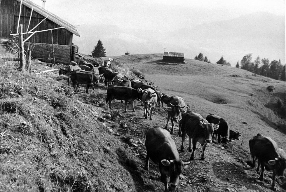 • Links oben im Eck die Alphütte und in der Mitte auf dem Hügel die bereits abgebrochene Hütte von Hammerer Hans ("Veastorles Hans"), Großdorf, Egg
