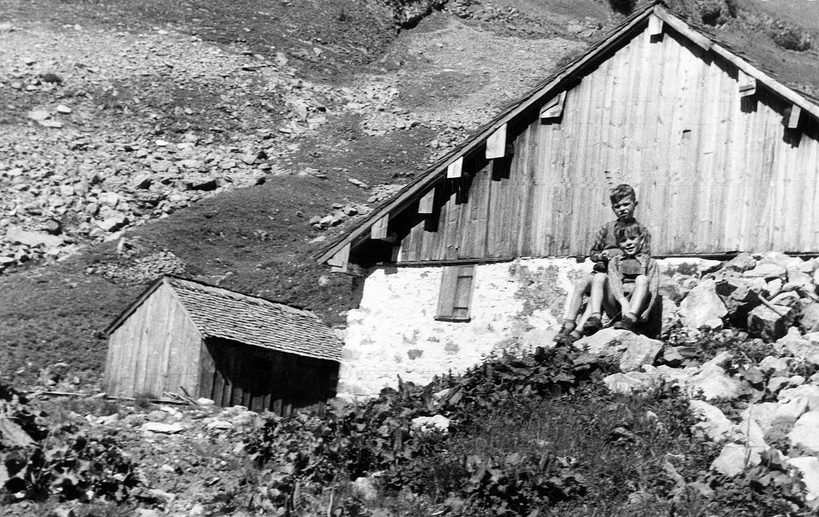 • Alphütte mit Stall der Alpe; vorne Troy Wolfgang (1952-) und hinten Troy Bertram (1948-); Bild um 1960 von Troy Ulrich