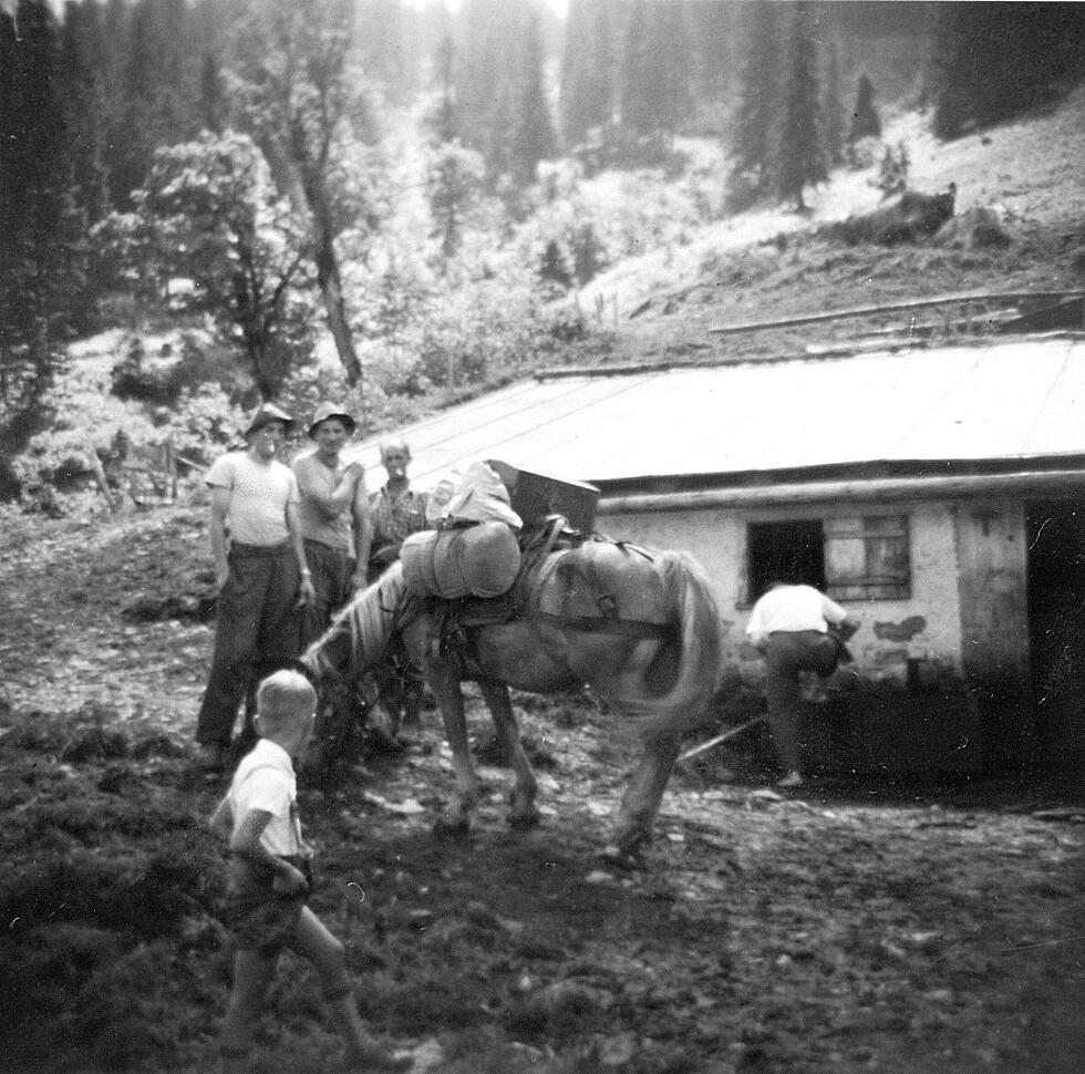 • Vor der Hütte v. li.: Thaler, Günther (Bub im Vordergrund); Oberhauser, Jodok (1937-); Müller, Norbert (1937-), zweimal unbekannt