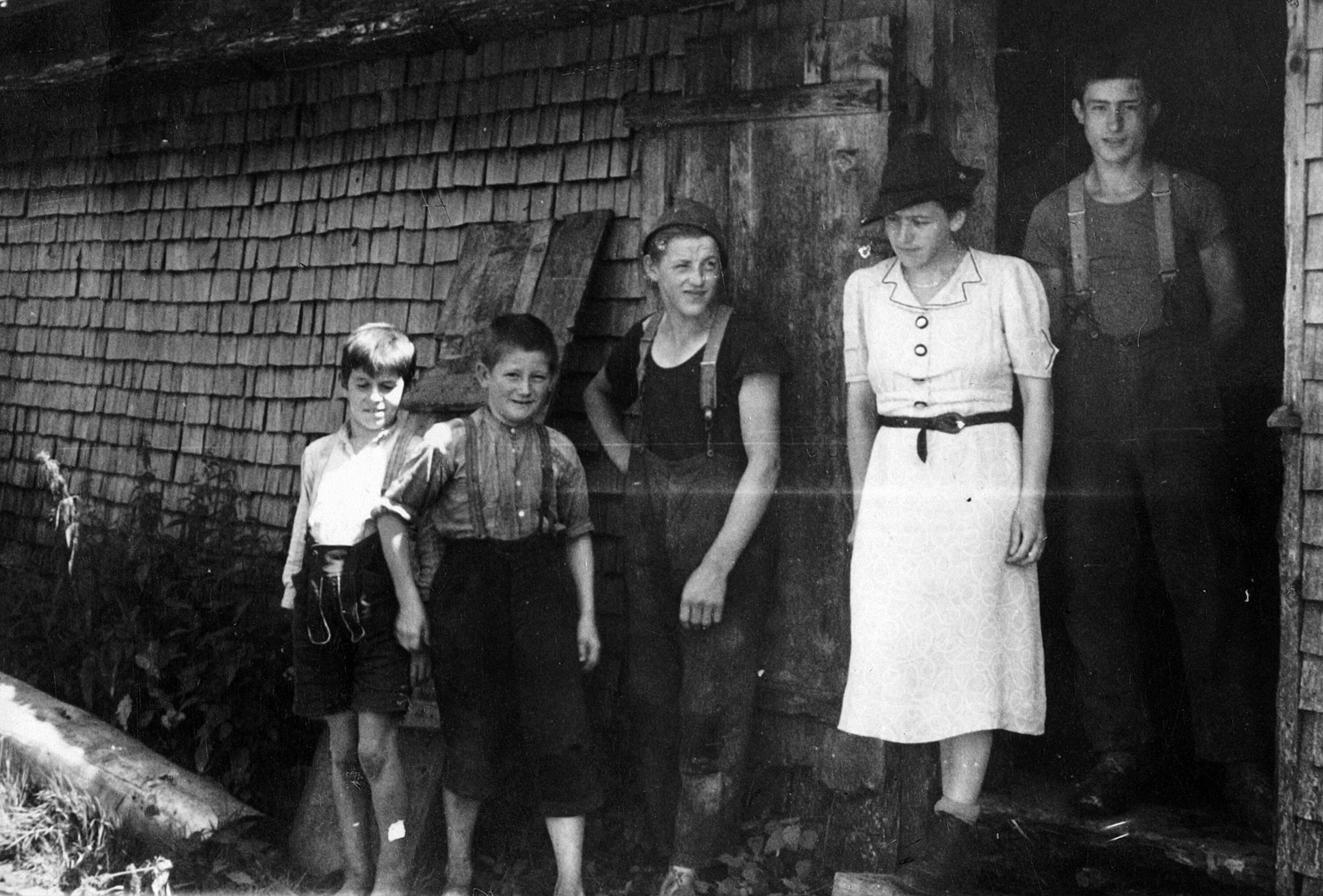 • Vor der Alphütte Rotenbach stehen v. li.: Kohler, "Nazele"; Feurstein, Alois; Kaufmann, Benedikt (1923-, gefallen); unbekannt; Feurstein, Gebhard (1922-1941, gefallen)