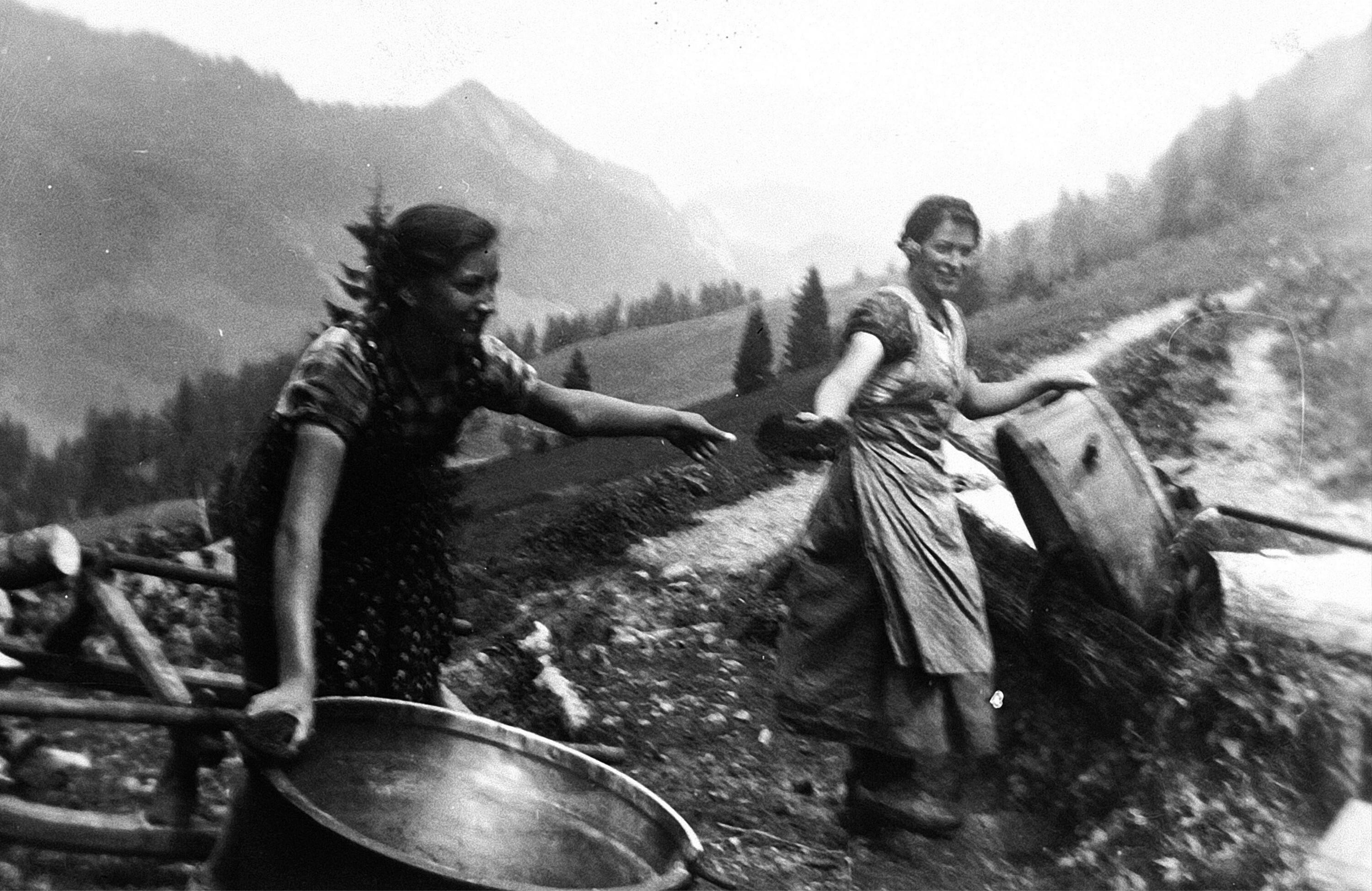 • Kesselreinigung auf Alpe Hintere Unterspitz; li. Meusburger Katharina (1920-, verh. Gmeiner, "Urbarlar"); rechts Meusburger Barbara (1919-1988, verh. Sutter)