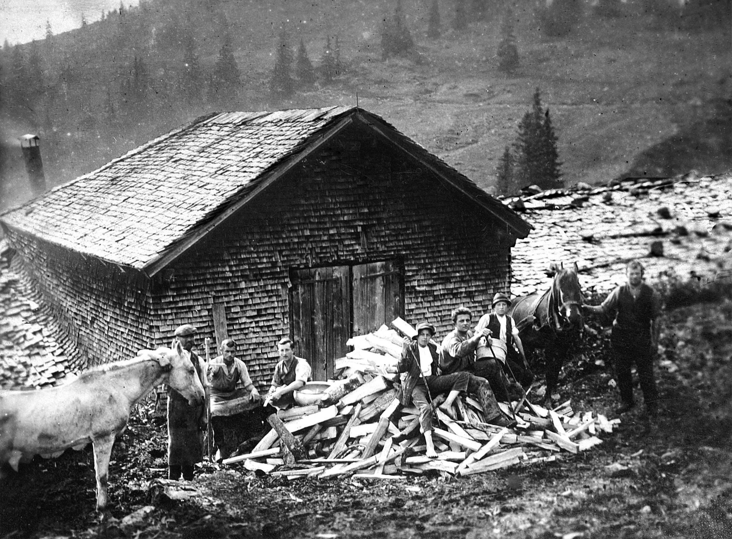 • Links Hütte Berbig; rechts Hütte Denz; zweiter von links ist Meusburger Leopold (1919-1968); die anderen sind unbekannt
