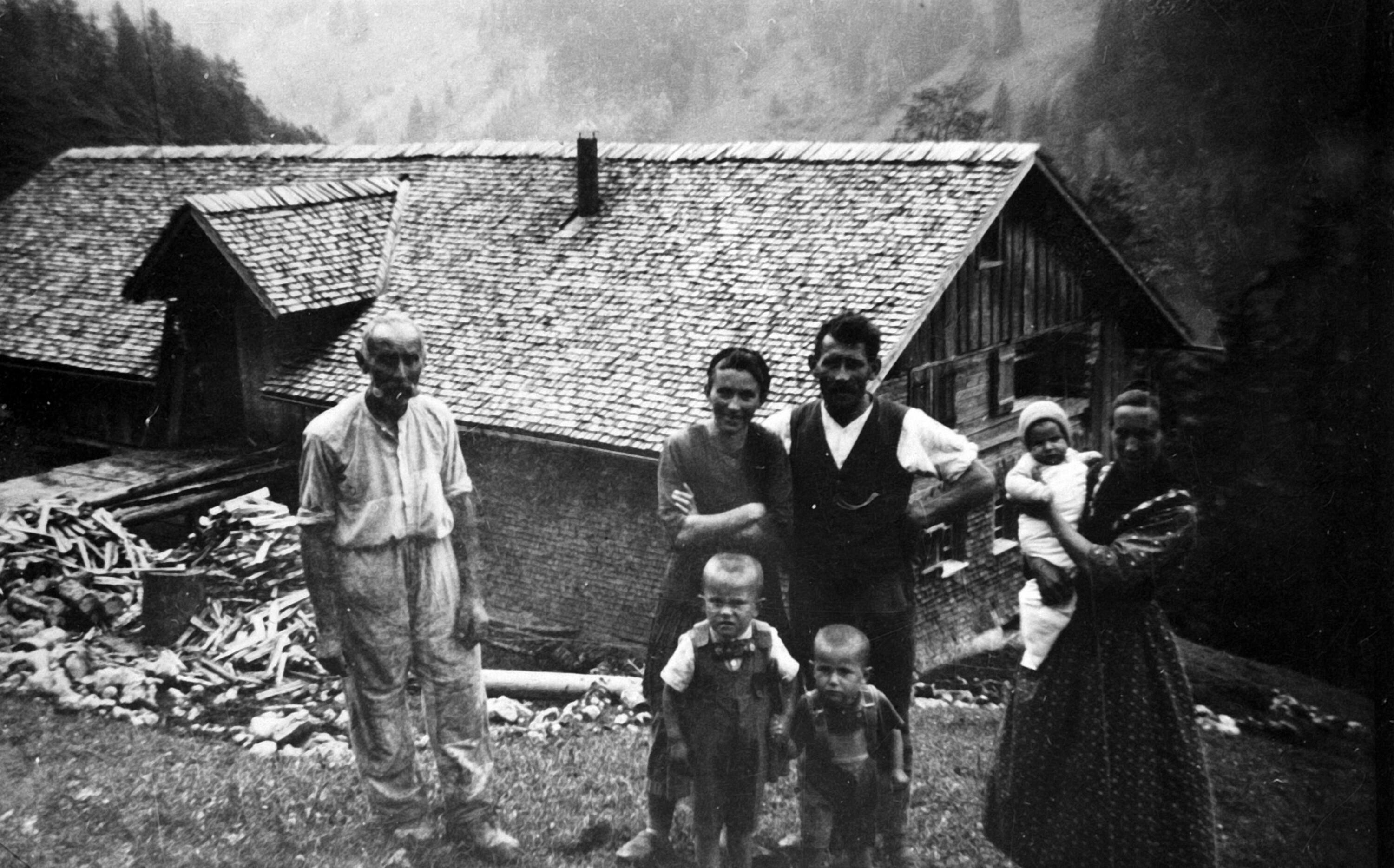 • Davor v. li.: Dünser Jodok (1860-1938); Fechtig Isabella (1906-1992, geb. Dünser); Gatte Fechtig Franz Josef (1910-1964); vor Isabella Sohn Fechtig Alois (1936-); rechts daneben Bruder Fechtig Jodok (1937-1978); Baby Fechtig Pius (1940-); Großmutter Fechtig Anna (1875-1939, geb. Meusburger)