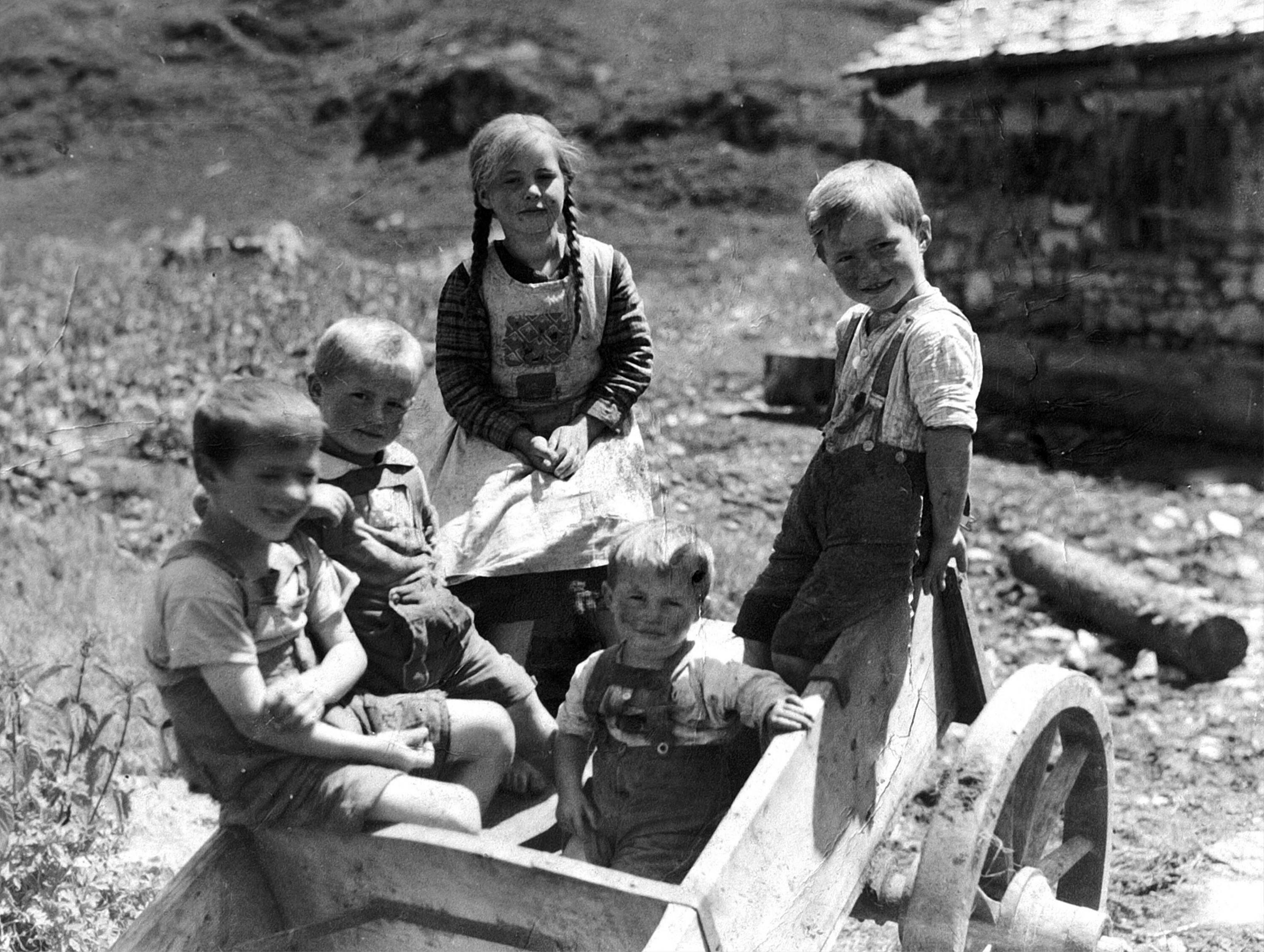 • Manser-Kinder im Bergwägelchen sitzend von links: Anton (1933-1994); Otto (1937-); Laura (1931-, verw. Madlener); Gebhard (1938-); Bernhard (1935-)