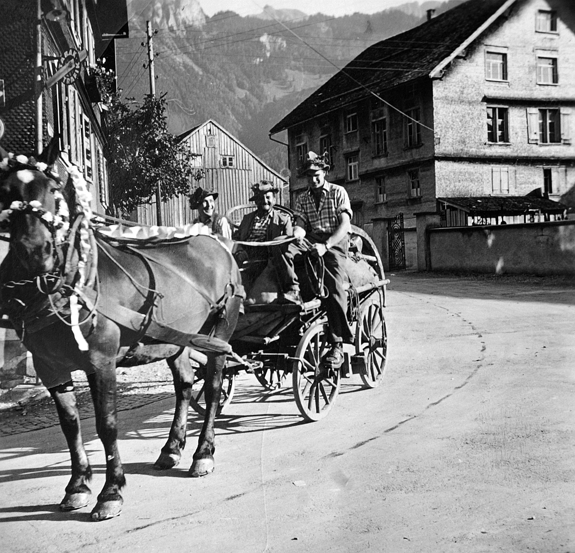 • Heimzug von der Bleichten Alpe beim GH Adler; v. li.: Dietrich Konrad (1922-1980); Kaufmann Hermann (1896-1964); Meusburger Josef (1930-)
