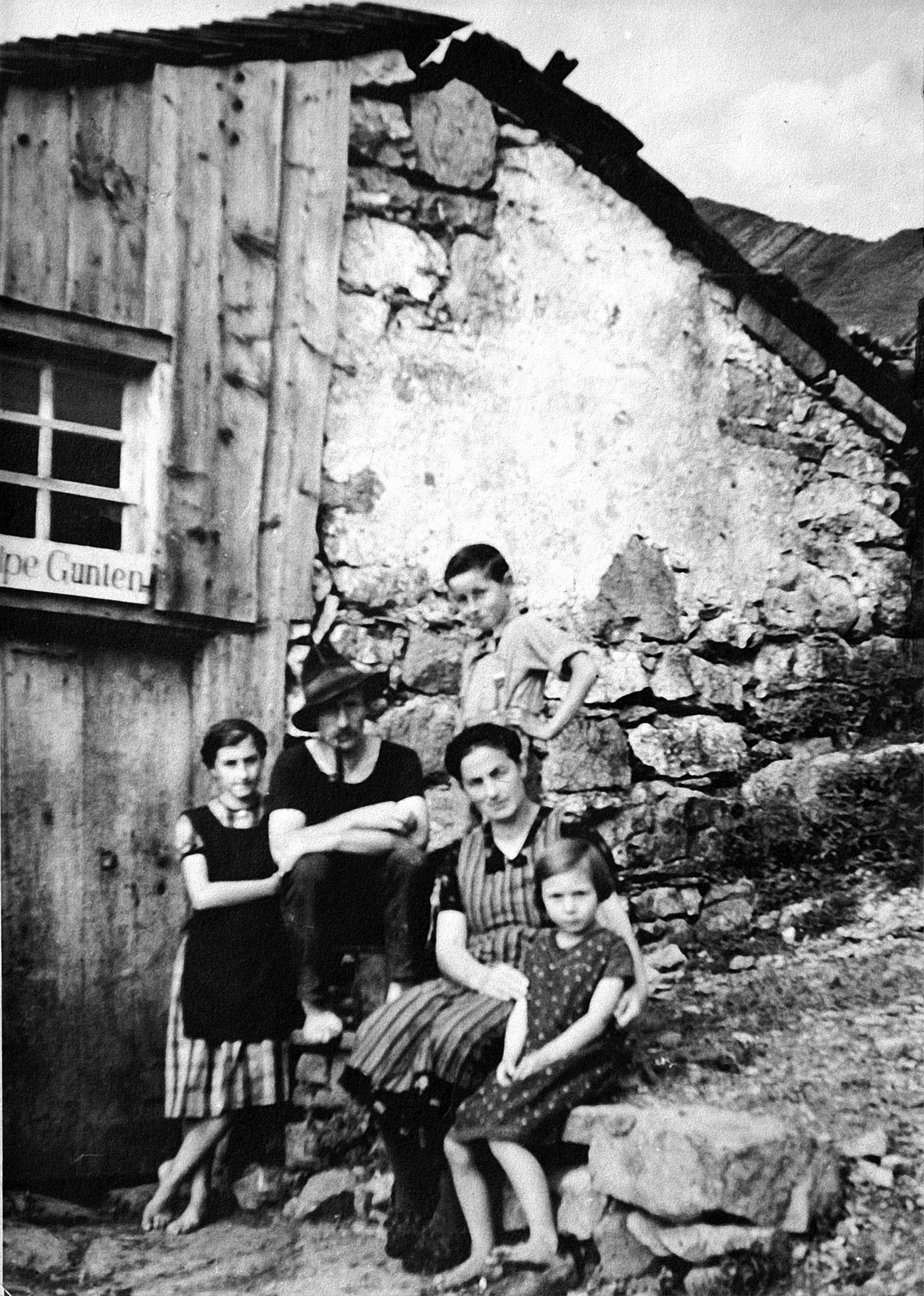 • Vor der Alphütte Gunten v. li.: Wüstner Katharina (1922-1992, verh. Schwendinger); Wüstner Josef (1896-1966); Wüstner Gebhard (1926-2005); Wüstner Agnes (1894-1979, geb. Felder), Wüstner Waltraud (1930-, verh. Meusburger)