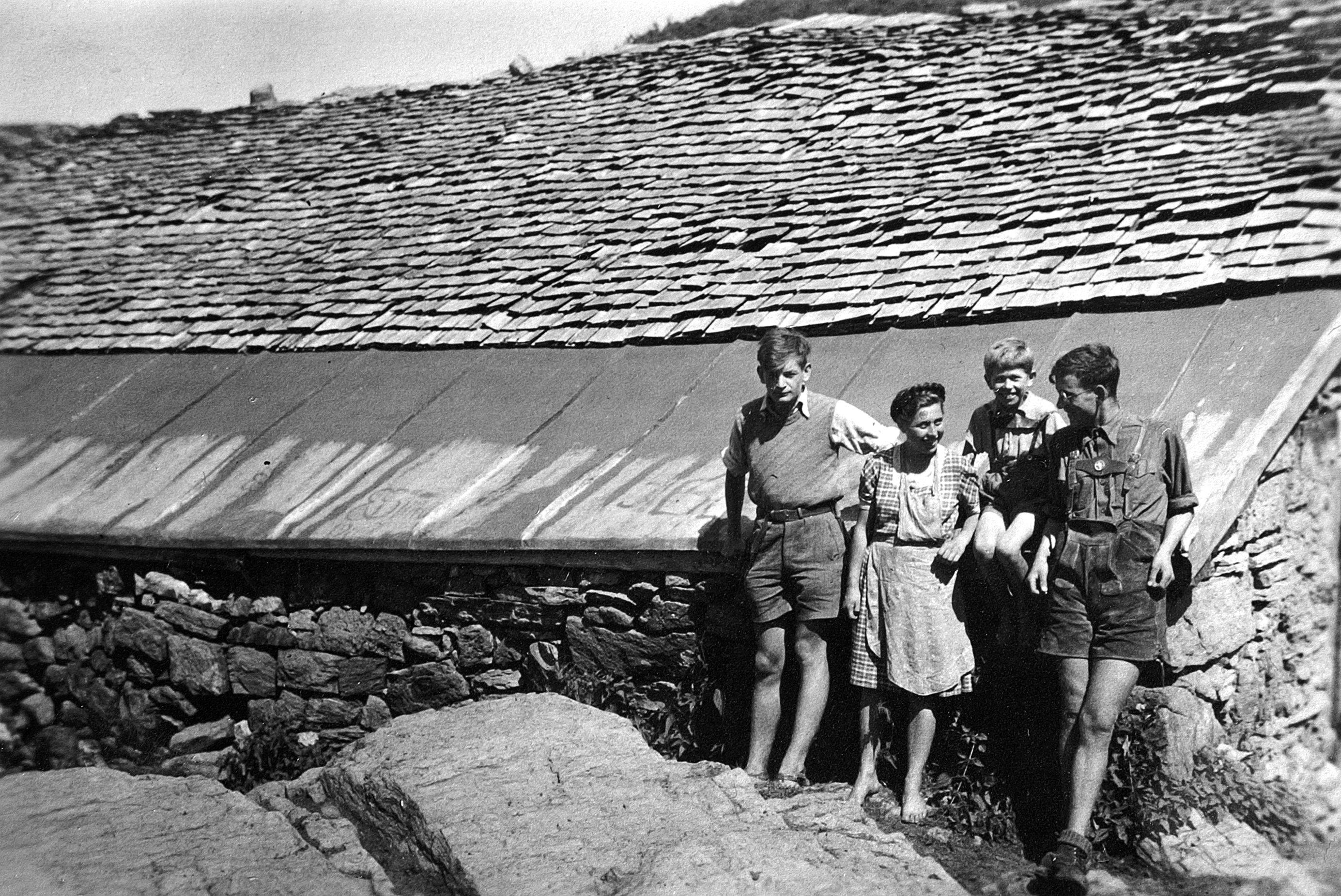 • Die bereits desolate Alphütte Wanna mit dem ausgebesserten Dach und unbekannten jungen Leuten vor der Hütte