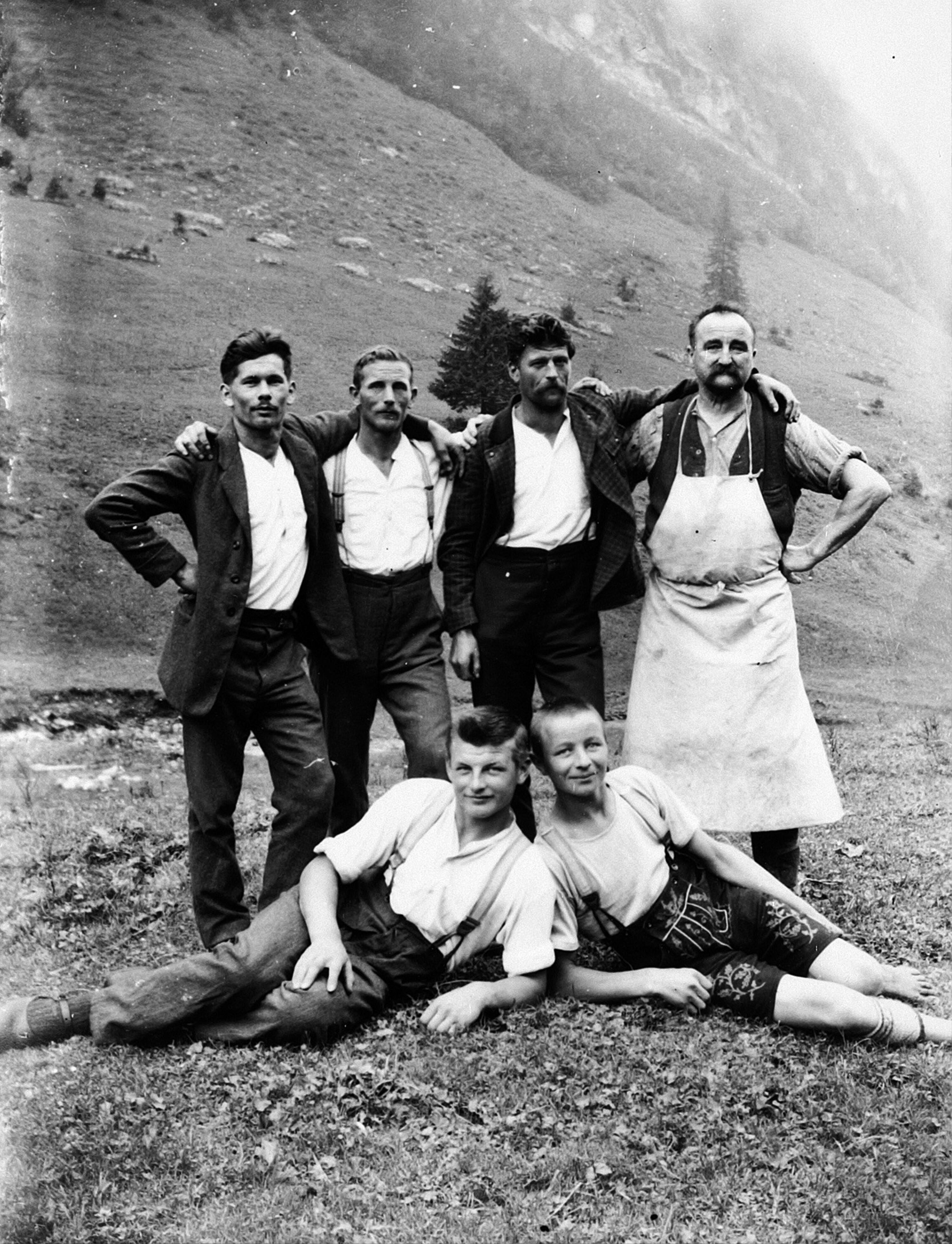 • Vor der Alphütte das Personal: vorne v. li.: Dietrich Leonhard ("Nazes Leanhard"); Bischof Josef (1907-1996, "Bischoffa Sepple"); hinten v. li.: Felder Peter (1904-1972); Bischof Josef (1898-1966); Meusburger Xaver; unbekannt