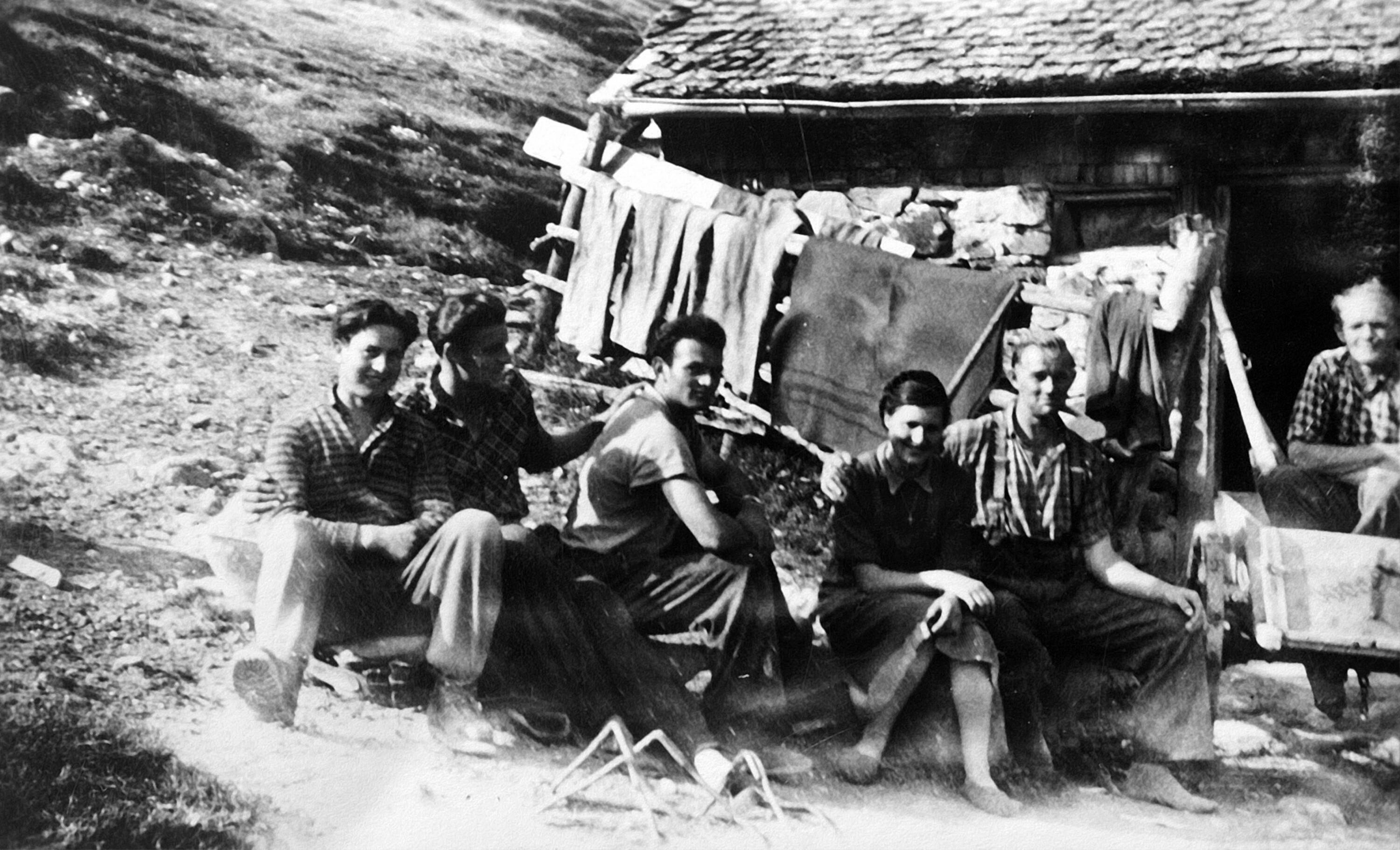 • Vor der Alphütte um 1956 v. li.: zweimal unbekannt; Zündel Bertram (1933-2008); Berbibig Hedwig; Kaufmann Anton (1929-2000); Wolf Anton (1919-)