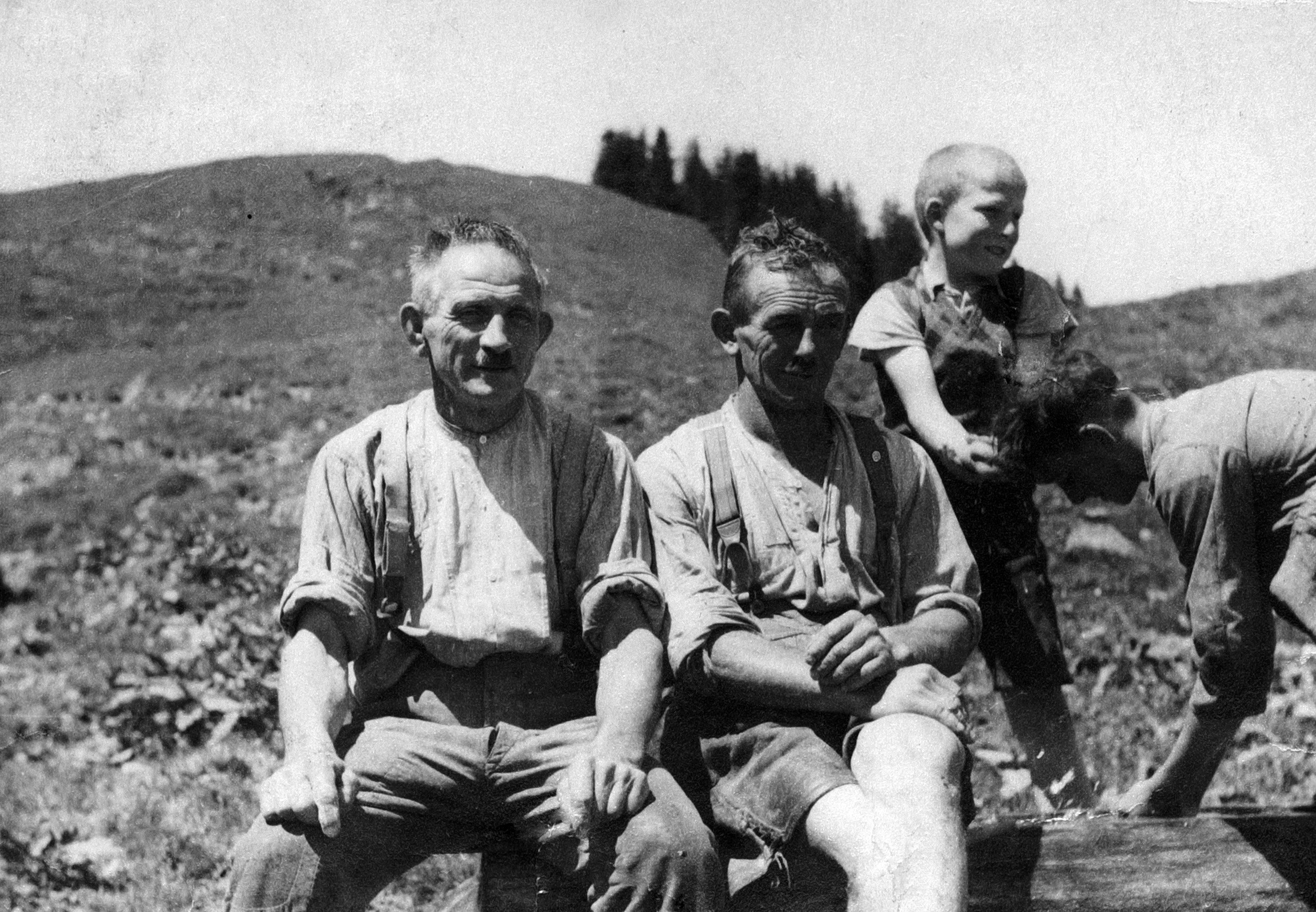 • Auf der Alpe Brendler v. li.: Moosbrugger Gebhard (1888-1952); Rüf Jakob (1899-1975, "Rüaflars Jokl"), Knecht bei Moosbrugger Hermann; Moosbrugger Erwin (1929-); unbekannt