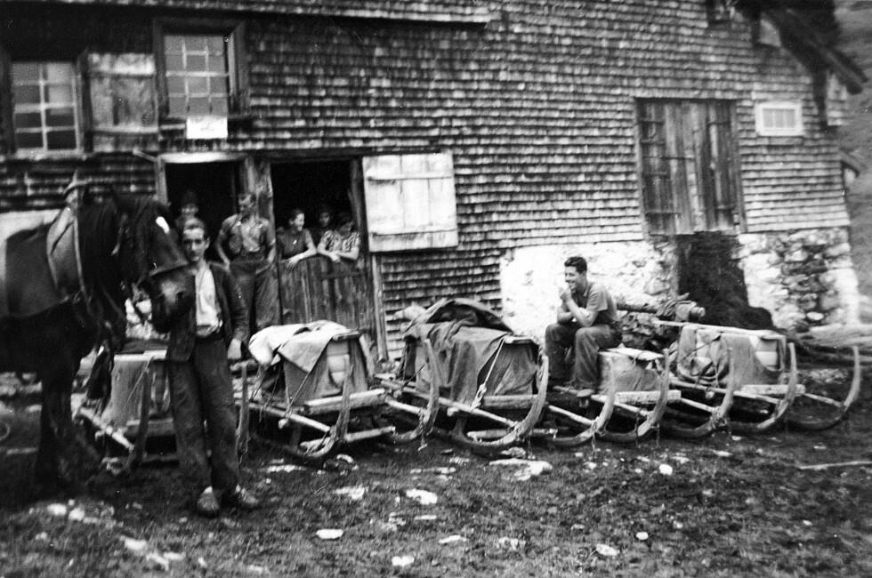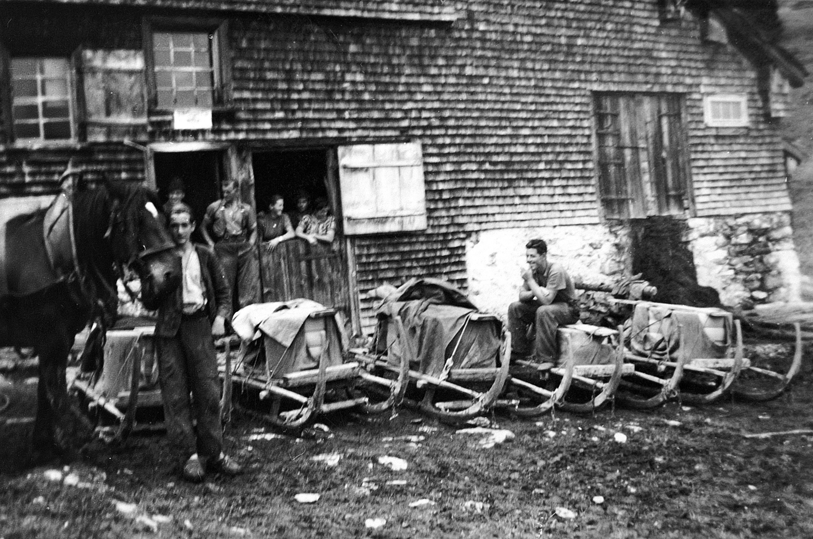 • Vor der Hütte stehen: 2. v. li. Kaufmann Anton (1929-2000); die anderen sind unbekannt