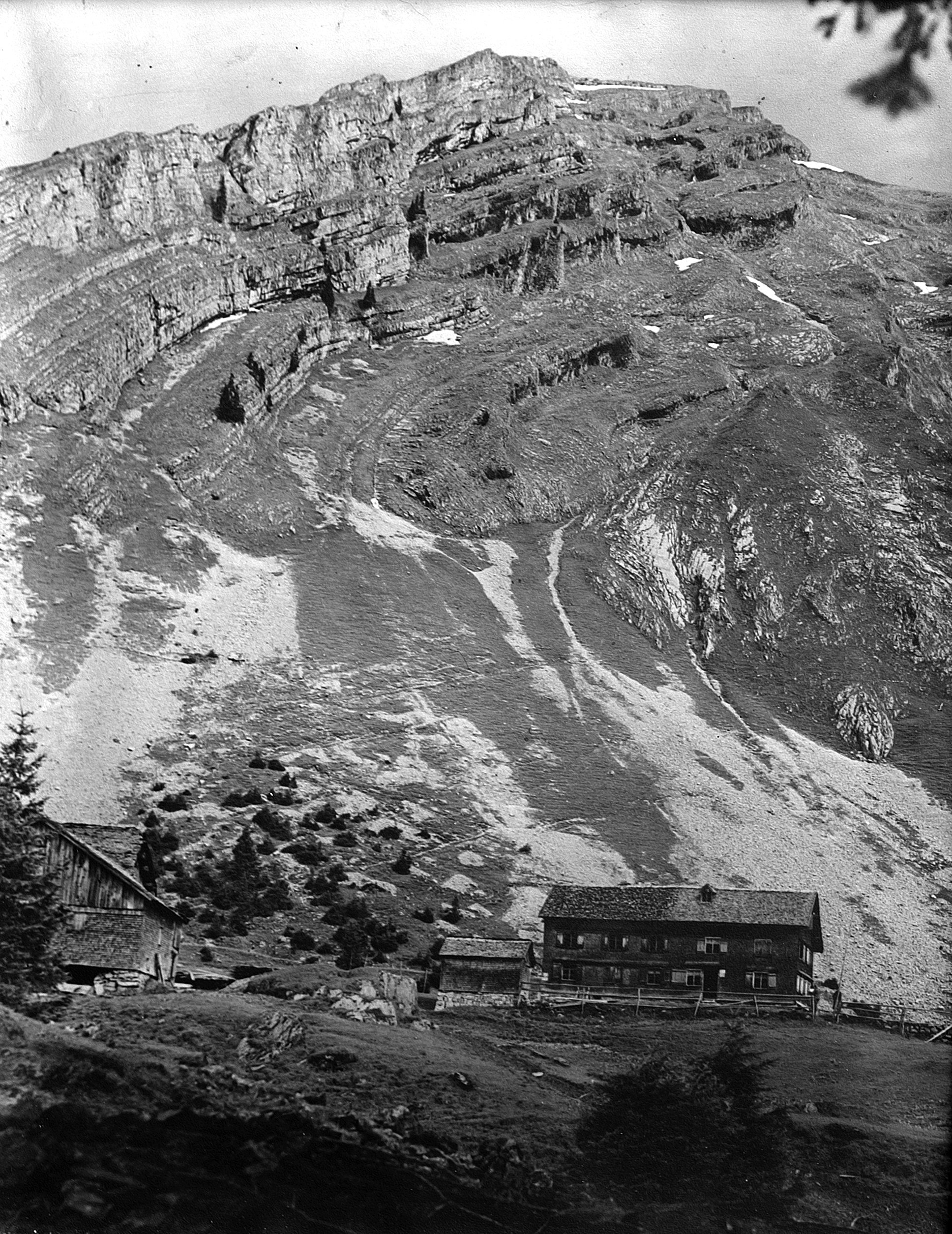 • Links die alte Alphütte bis 1946; re. das Gasthaus (Dünser Josef), 1954 von einer Lawine weggerissen