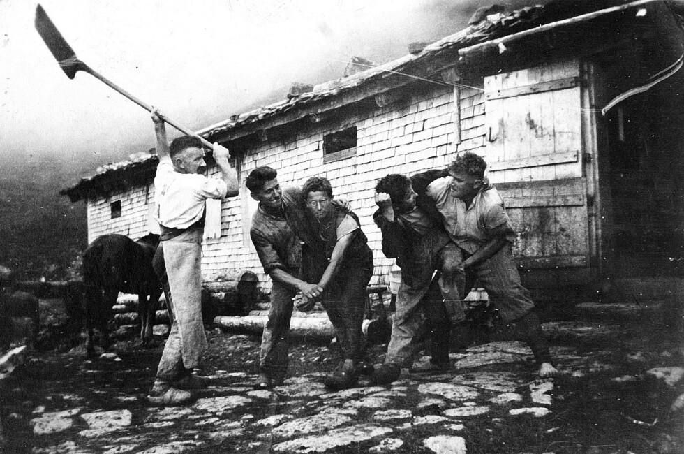 • Spaßszenen vor der Neuhornbachhütte; Darsteller v. li.: Vogt Alois (1878-1964); Wüstner Matthias; Baurenhas Wendelin (1919-); Wirthensohn Matthias (1921-1943, gefallen); Sutter Ernst (1912-2007)