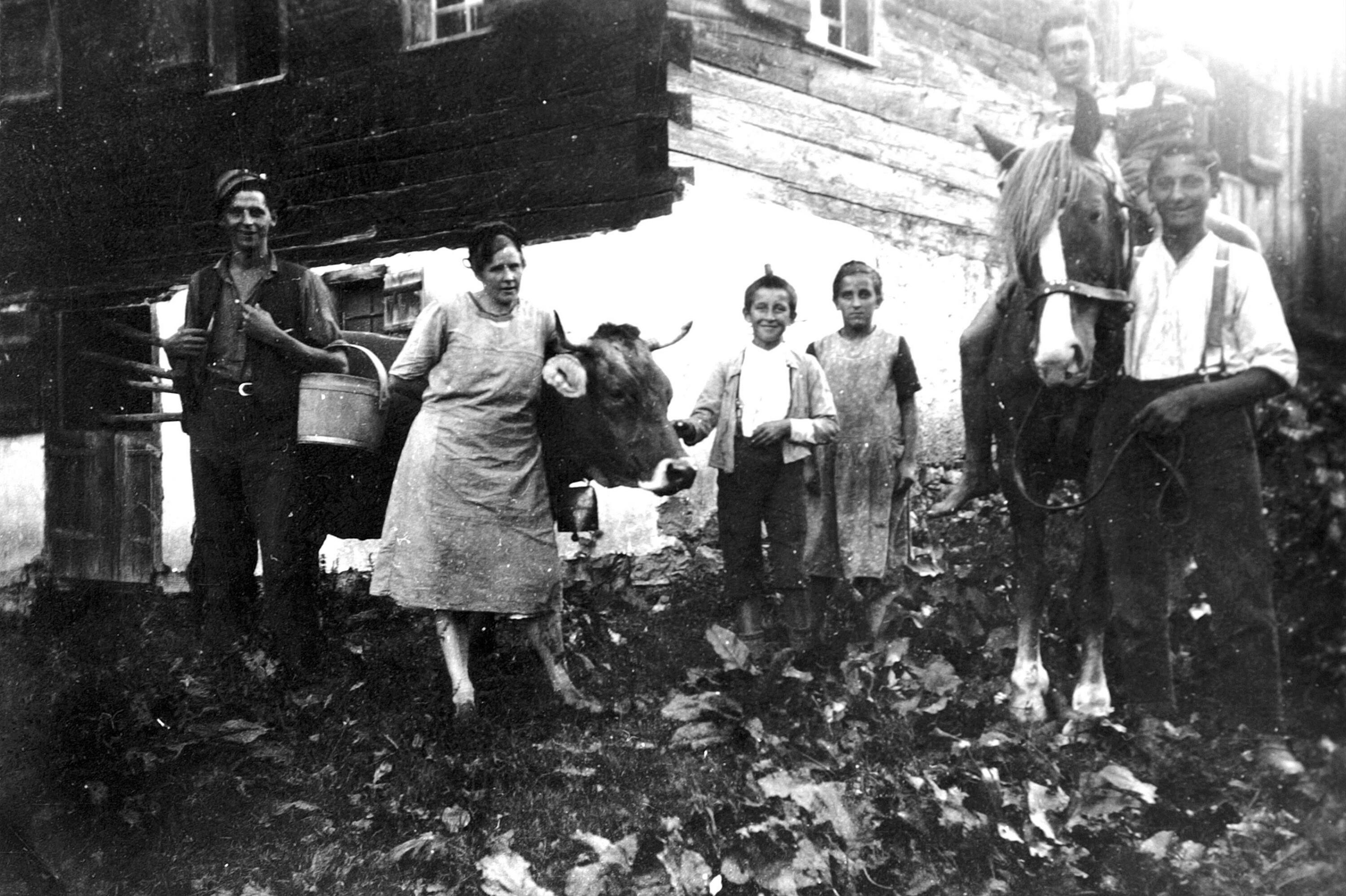 • Pers. v. li.: Jochum Christina (1904-1958, verh. Fetz); Pfefferkorn Ferdinand (1922-); Pfefferkorn Rosa (1923-); Knecht Häusler Martin beim Pferd links und auf dem Pferd Jochum Fidel (1933-)