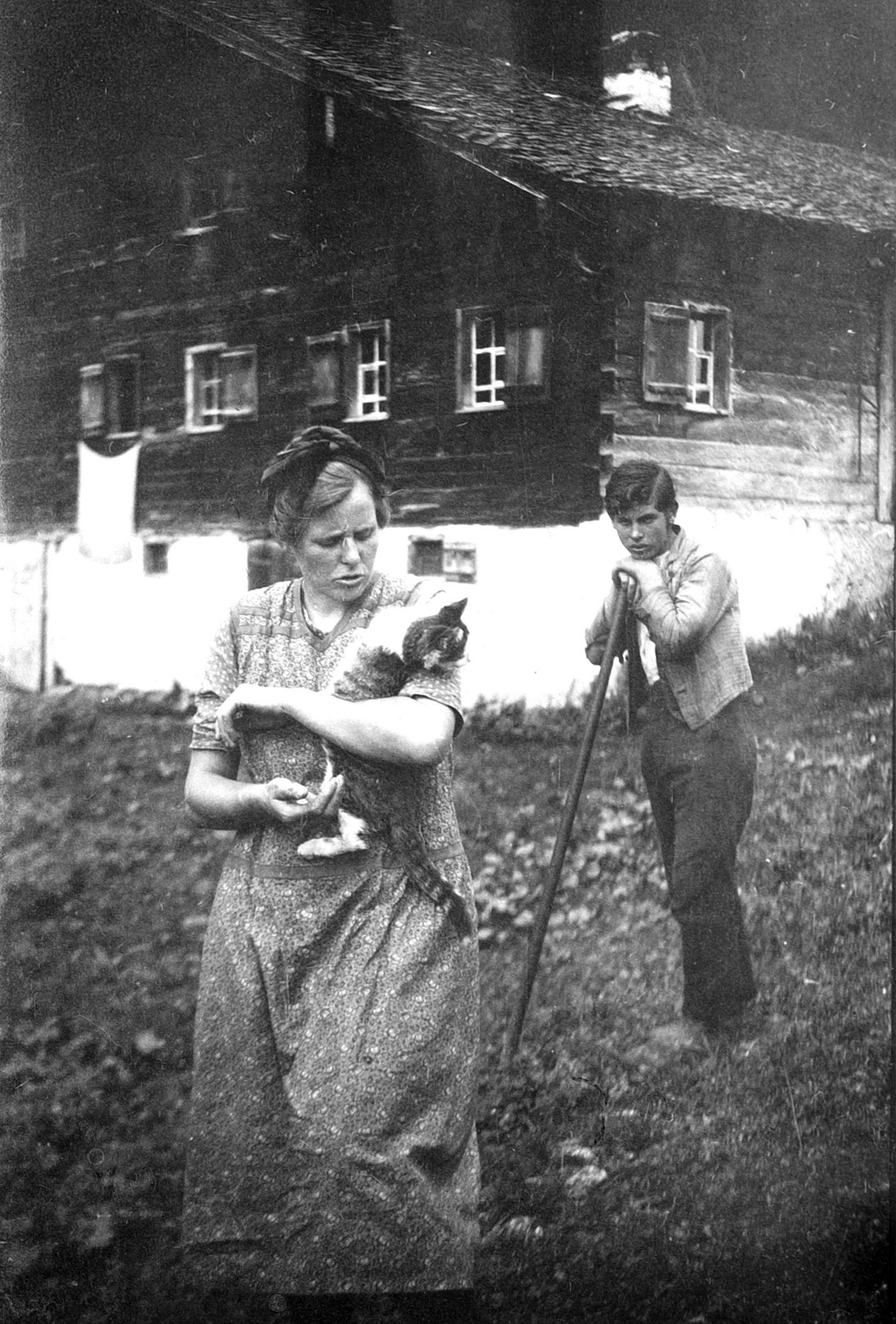 • Vor der Alphütte Treu in der Mitte Jochum Christina (1904-1958, verh. Fetz); Bub re. ist unbekannt