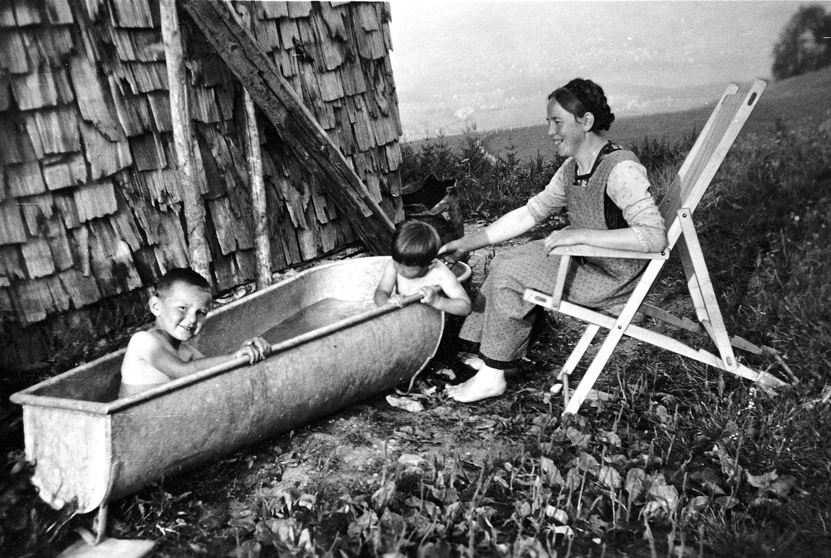 • Ein Bad vor der Hütte; v. li.: Lang Bertram (1931-2004); Lang Christina (1932-, verh. Notter); Lang Anna (1897-1942, geb. Metzler, "Uhramachers")