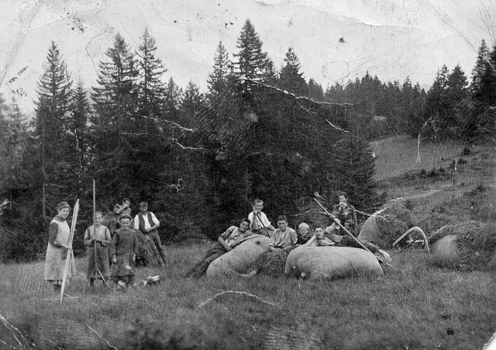 • Auf dem Berggut vom Klausberg-Vorderstück gegen die Weißenfluh; Pers. v. li.: Flatz Franziska ("Franza Gidis Franziska", verh. Streitler bzw. Wirth); Flatz Maria (verh. Kohler); hinten Kaufmann Bartle (1886-1967); davor Schmid Margret (1918-2004, verh. Schneider); Greber Josef ("Veres Josef"); Flatz Anton; Schmid Anton (1915-2006); ein gewisser Wohlgenannt aus Dornbirn (auf dem Vorsäß nannte man ihn "Bürgermeister", weil er immer anwesend war); Kaufmann Franz (1923-1935); "Hans" (wuchs bei der Säge im Loch auf und verschwand unbemerkt während des Kriegs); Kaufmann Josef (1924-2000); dahinter Mutter Kaufmann Maria (1893-1973, geb. Greber)