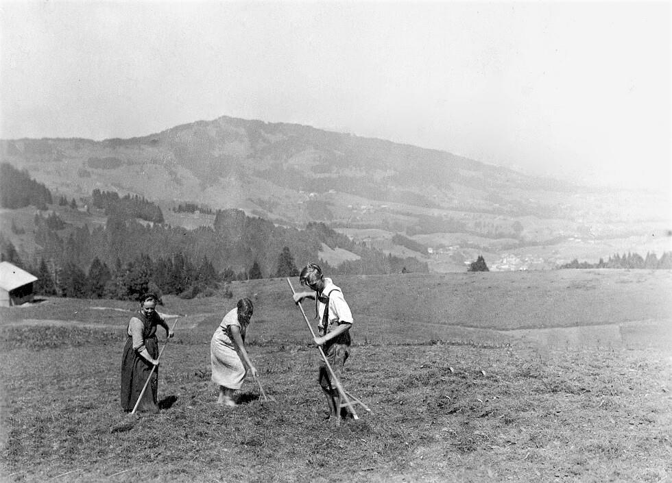 • Weidefläche vom Vorsäß Hinterstück; li. Zündel Anna (geb. Düringer); die anderen zwei sind Gäste