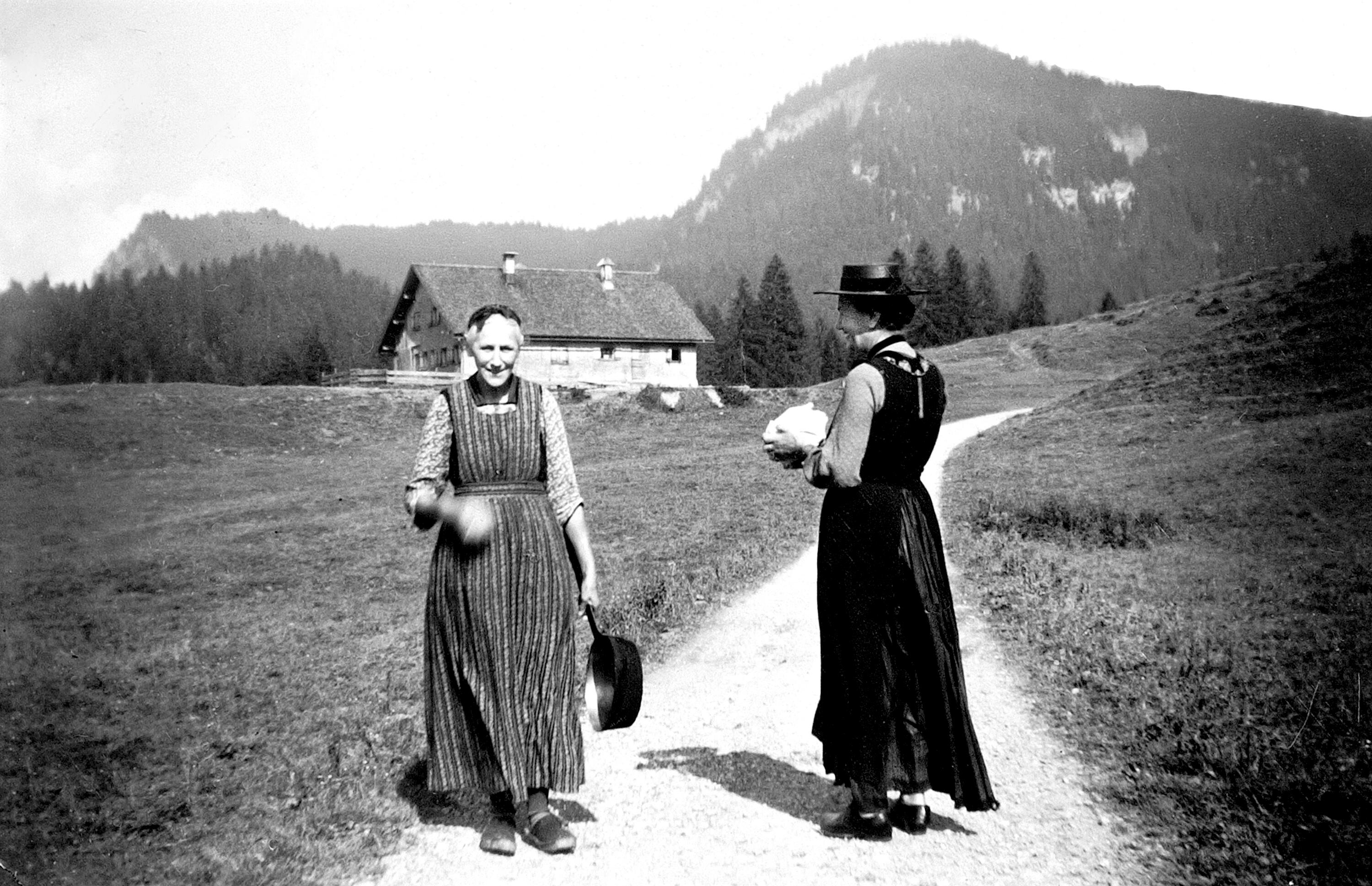 • Standpunkt der Frauen noch auf der Alpe Halde mit Blick zu einer Schönenbacher Hütte; links Fetz Anna (1891-1972, geb. Felder); re. "Ruppa Sepple's" (Moosbrugger) Frau vom Wälderhaus