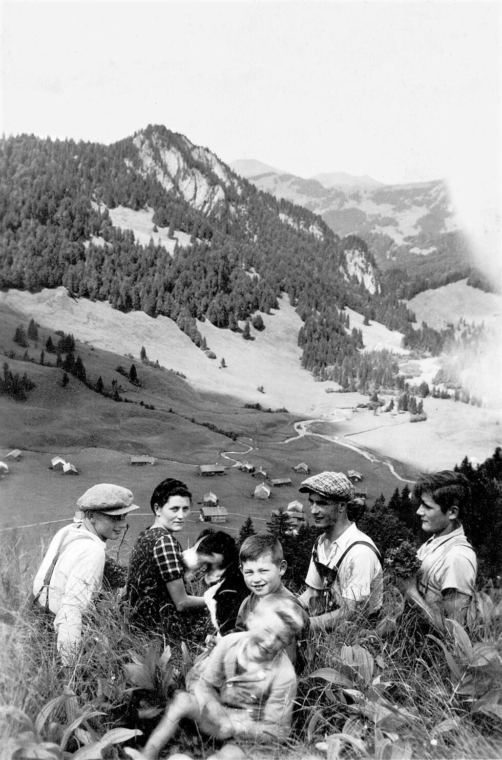 • Blick vom "Unterspitz" auf das Vorsäß Schönenbach; im Vordergrund einige unbekannte Wanderer
