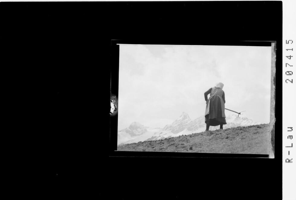 [Bäuerin beim Düngen / Blick zur Zimba]