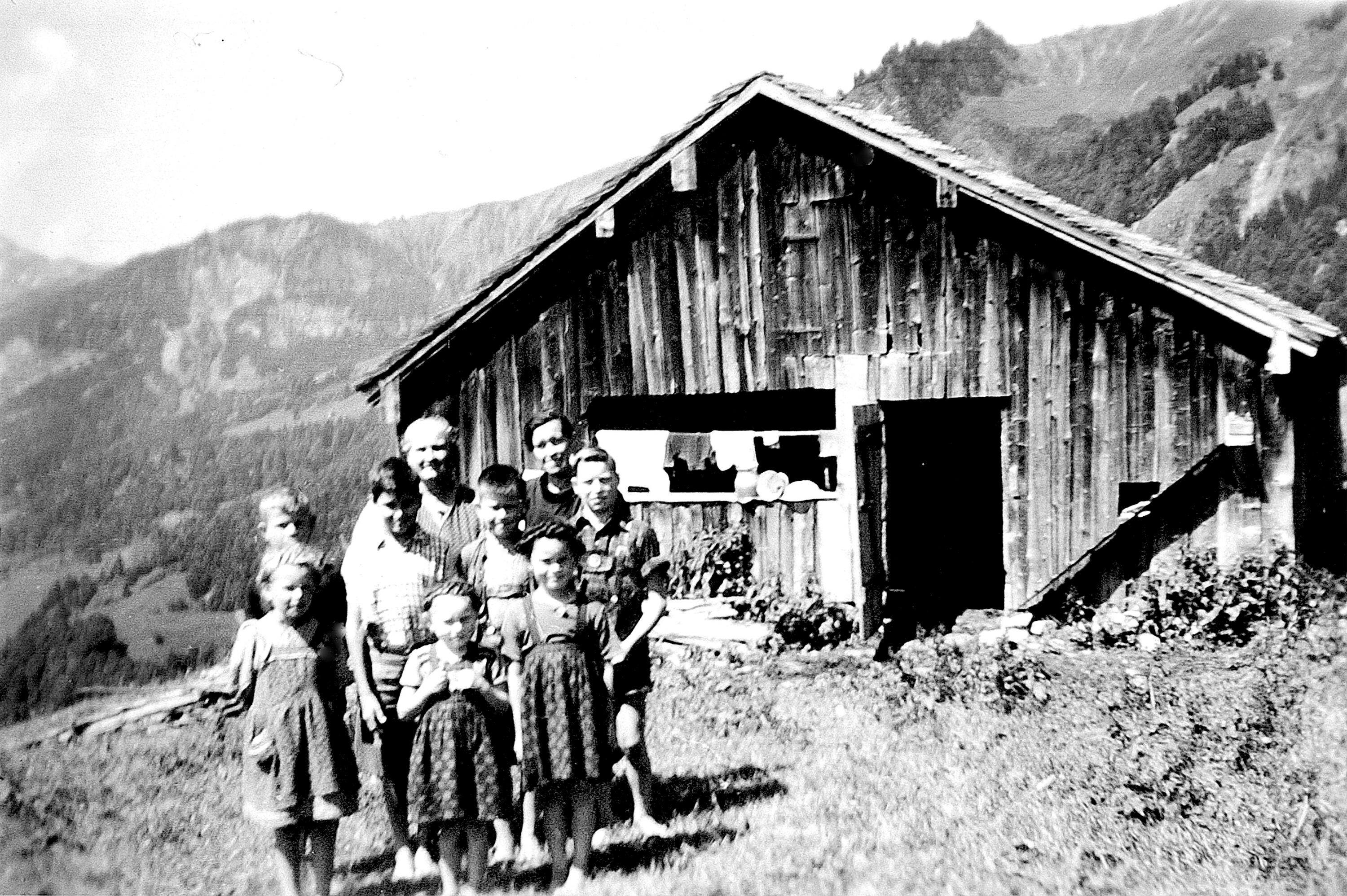 • Hütte vom Meusburger Ottilia (geb. Hager); Pers.: vordere Reihe v. li.: Greußing Annelies (1941-, verh. Dietrich); Moosmann Margreth (1944-, verh. Huber); Moosmann Marianne (1943-, verh. Heinzle); mittlere Reihe: Giesinger Bartle (1940-); Meusburger Leonhard (1939-); Moosmann Josef (1941-); Rüf Anton (1936-); hintere Reihe: Natter Margreth (1896-); Moosmann Emma (1907-1989); Bild um 1953/54