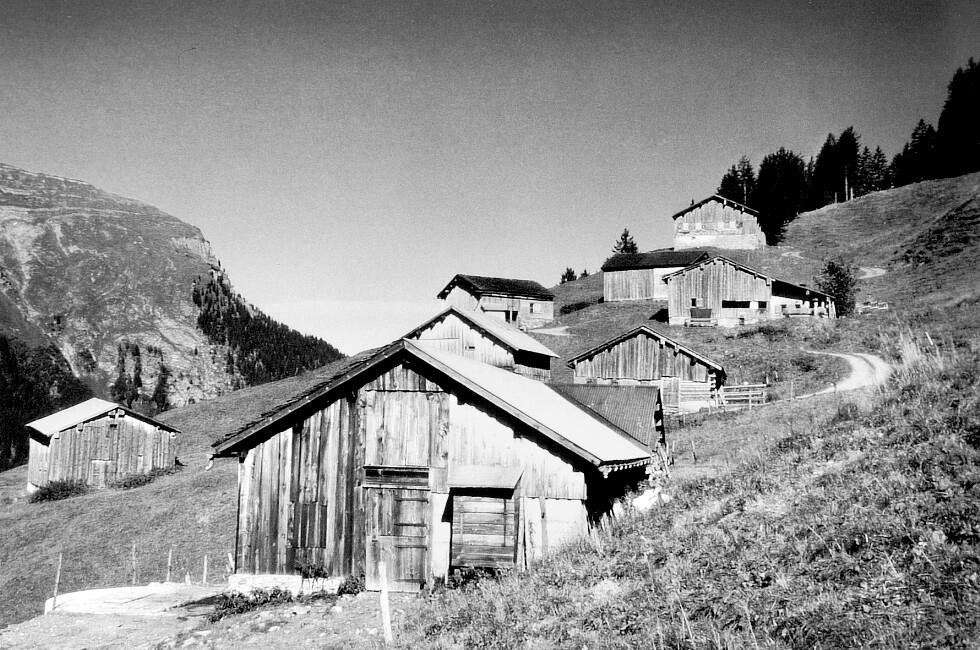 • Vorsäß Argen Dorfansicht; Hütten v. li.: Moosbrugger Heinrich (heute Muxel Albert); Sennerei; Berbig Anna; re. davon Moosbrugger August; Rüf Albert; Berbig Josef Anton; Rüscher Franz Michael; Erath Anton