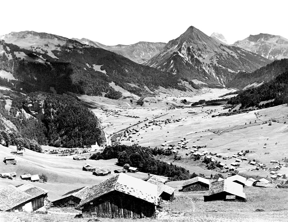 • Blick über die Dächer vom Vorsäß Ahornen nach Au bis zur Üntschenspitze