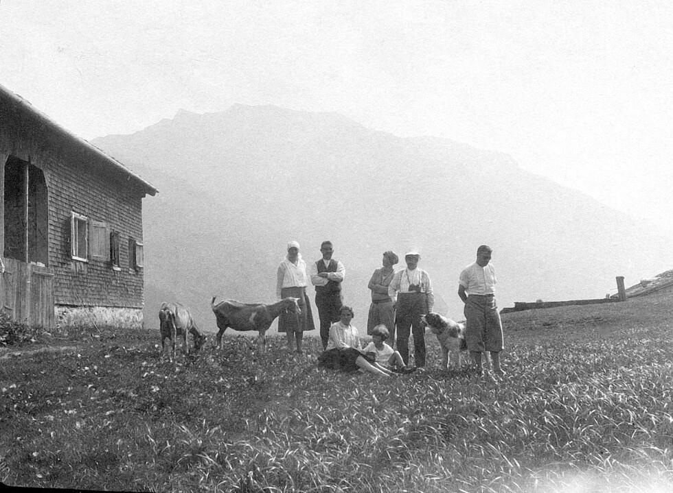 • Hütte Johann Georg Moosbrugger; 2. v. links Kronenwirt Schoppernau; Gäste