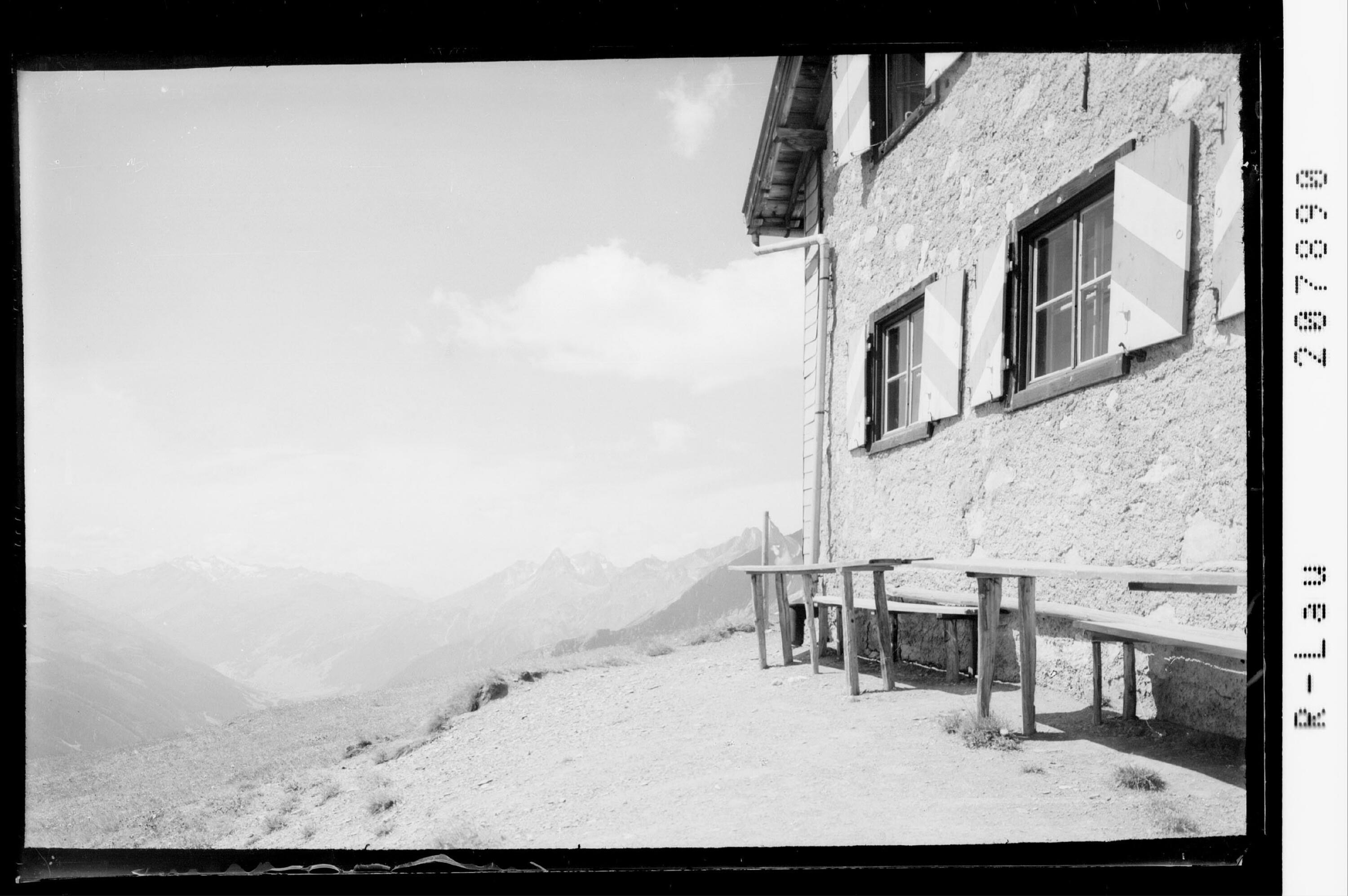 [Ansbacher Hütte mit Blick in's Arlberggebiet mit Kaltenberg und Valluga]