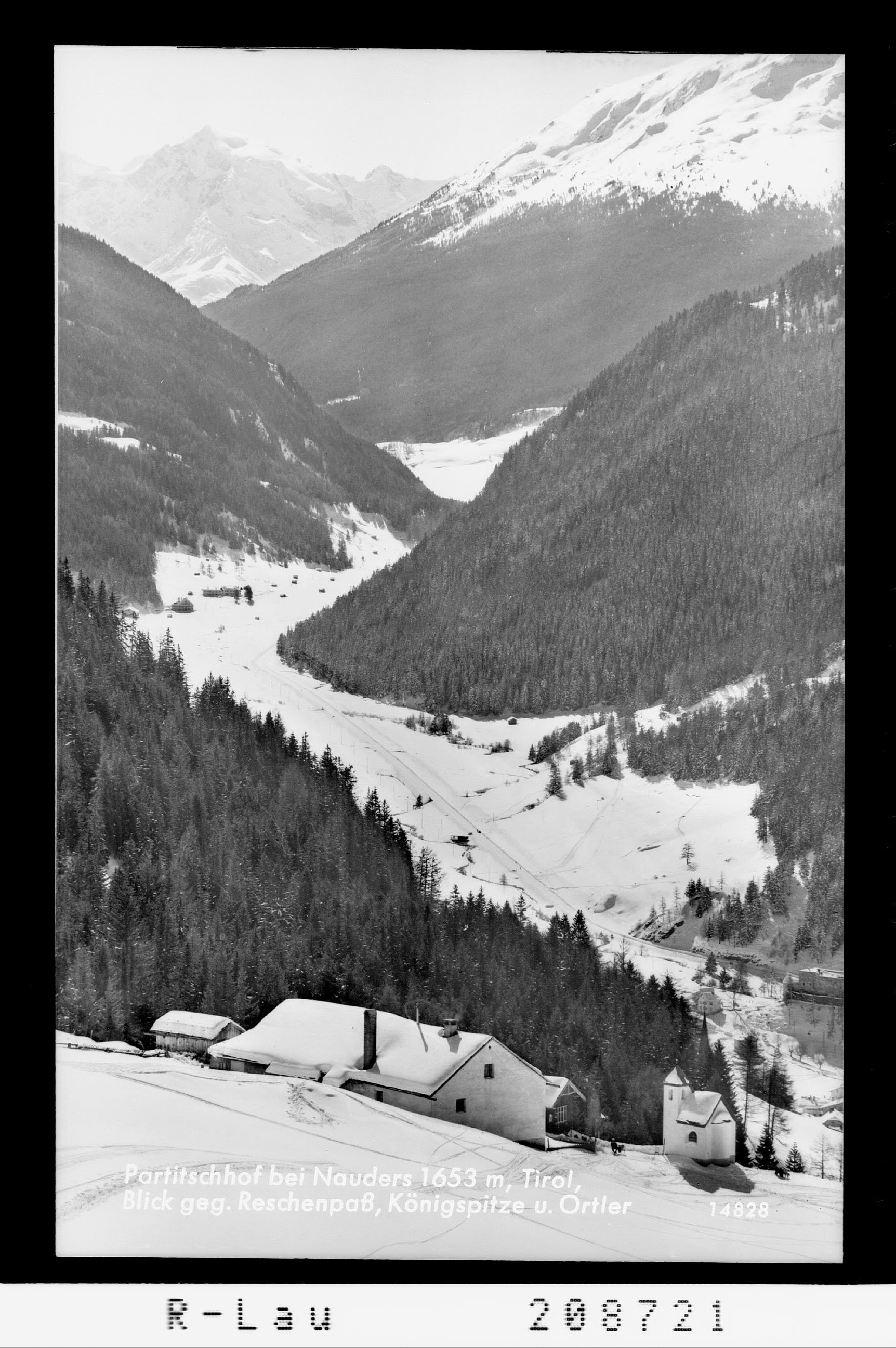 Partitschhof bei Nauders 1653 m, Tirol, Blick gegen Reschenpass, Königspitze und Ortler