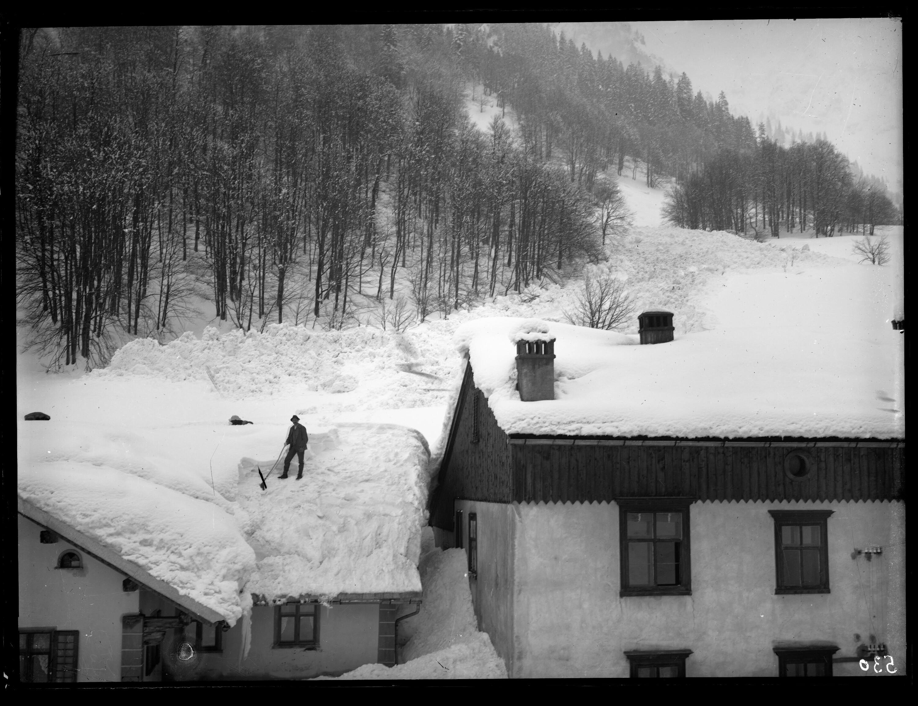 • In der linken Bildhälfte (Hnr. 26) ist eine Person bei der Freilegung des Hausdaches von den Schneemassen zu sehen. Ferner sind im Bildhintergrund die Schneemengen einer abgegangenen Lawine zu erkennen. (Text: Michael Laublättner)