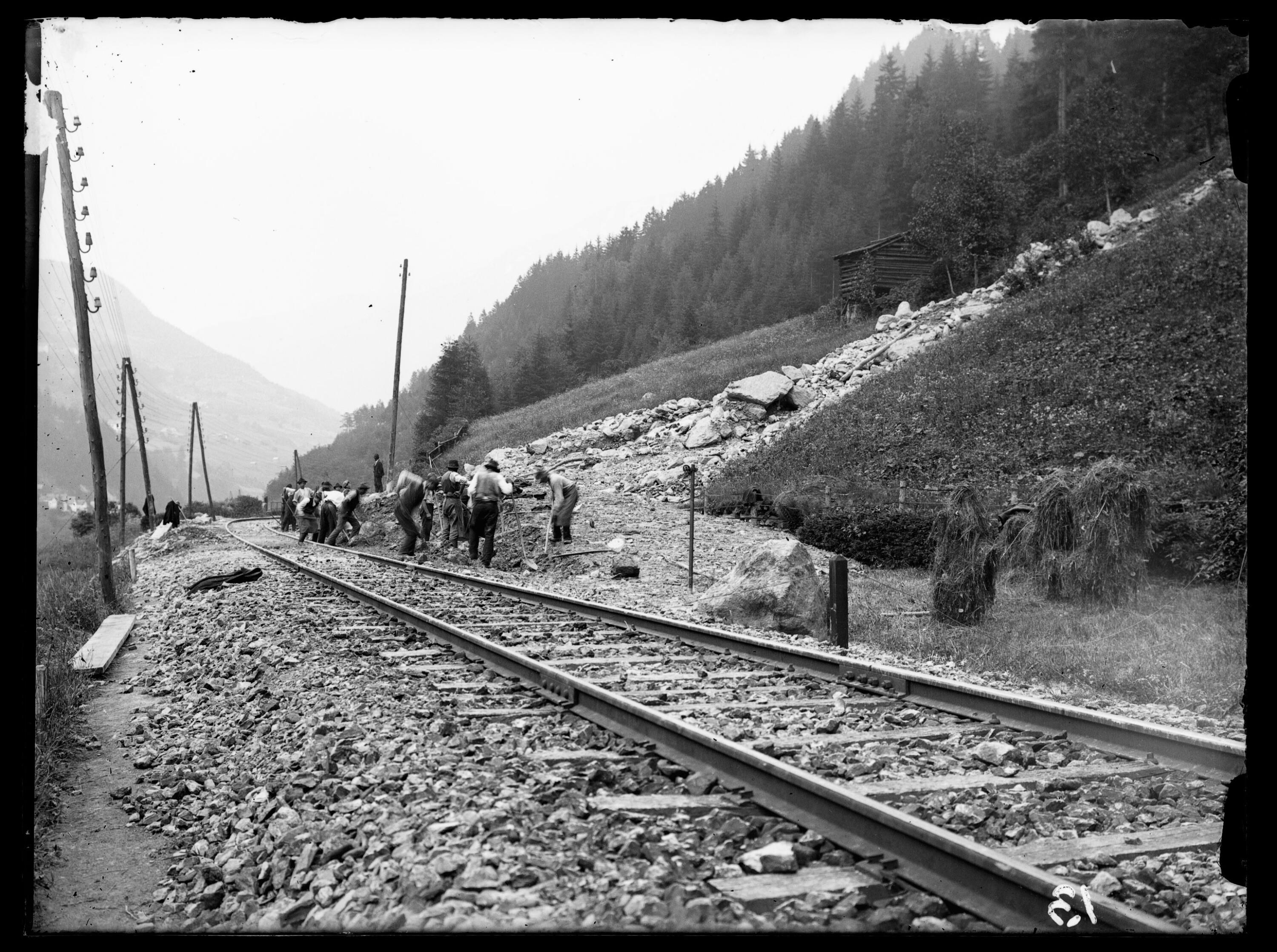 [Murgang auf die Strecke zwischen Langen am Arlberg und Klösterle im km 111,3 (Streckenarbeiter bei der Beseitigung des Geschiebes)]