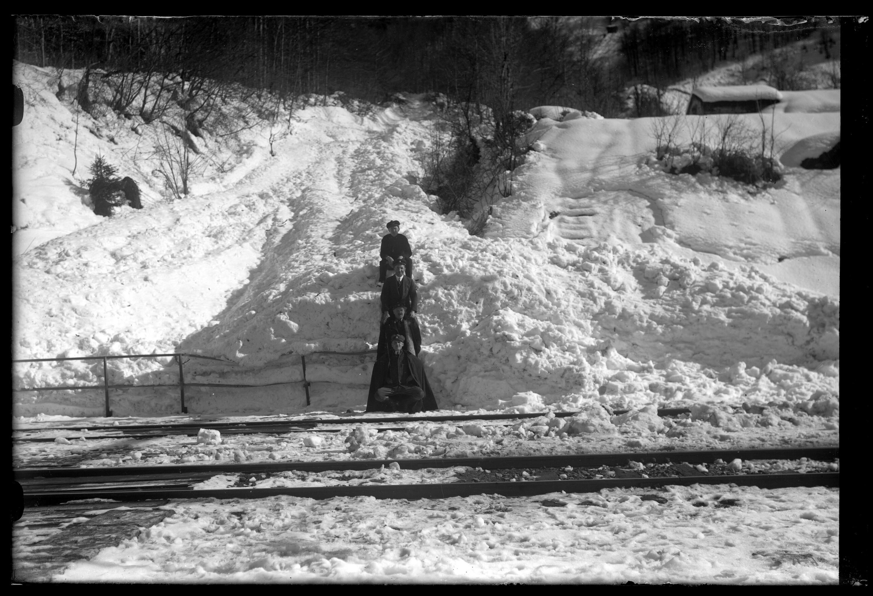 • Diese Aufnahme entstand unmittelbar nach dem Abgang der Muttentobellawine (vermutlich am 07.03.1926), bei dem mehrere Bahnhofsgleise verschüttet und zwei Güterwaggons aus den Gleisen geschoben wurden. (Text: Michael Laublättner)