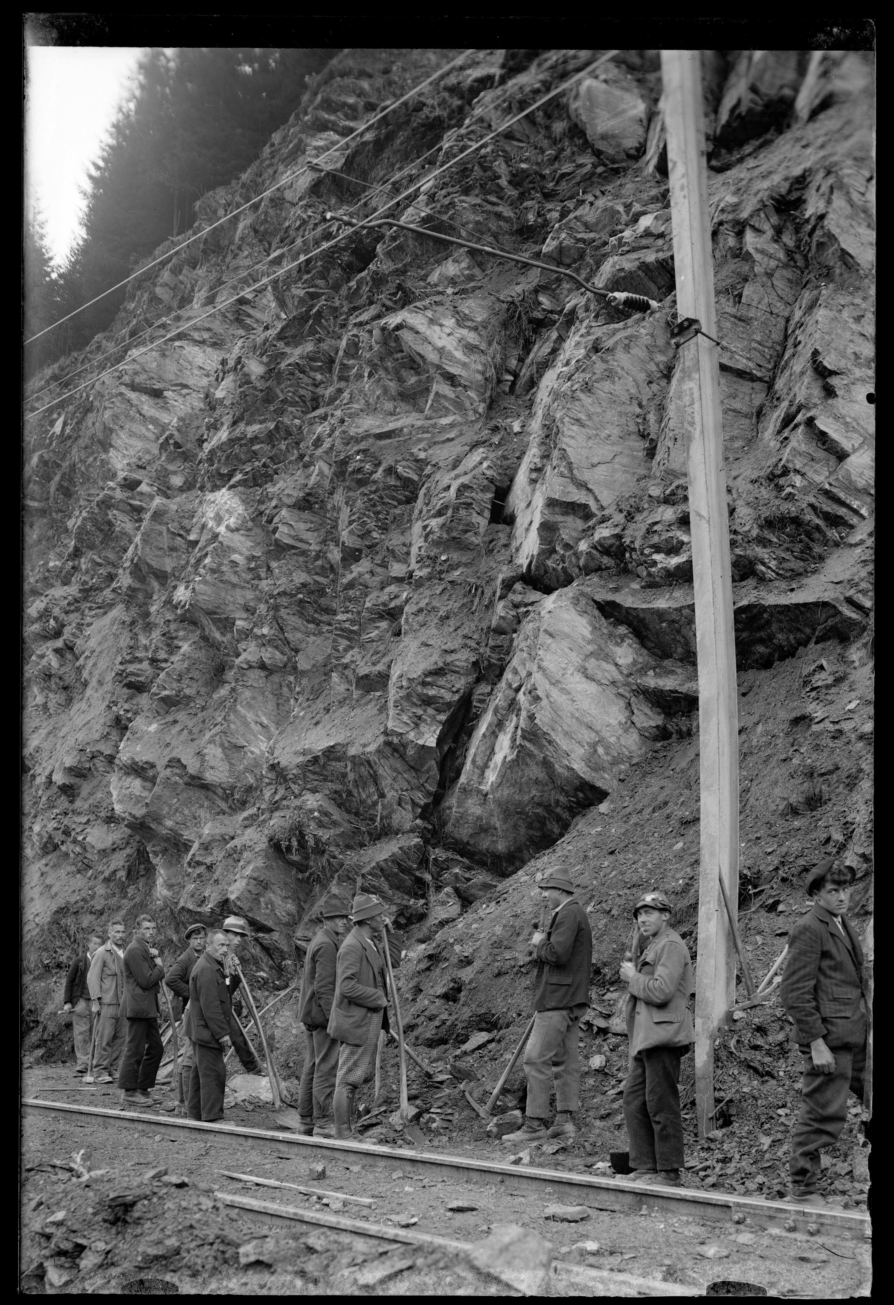 [Aufräumarbeiten nach dem Abgang eines Felssturzes auf die Bahntrasse zwischen Flirsch und Schnann Hst neu im km 88,5]