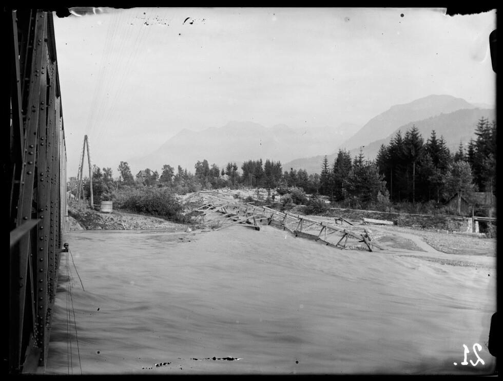 • Das Bild dürfte nach einem Hochwasserereignis entstanden sein. In der rechten Bildhälfte ist der in die Ill einmündende Samina-Bach zu sehen. Strecke noch eingleisig und nicht elektrifiziert. Bild SEITENVERKEHRT. (Text: Michael Laublättner)