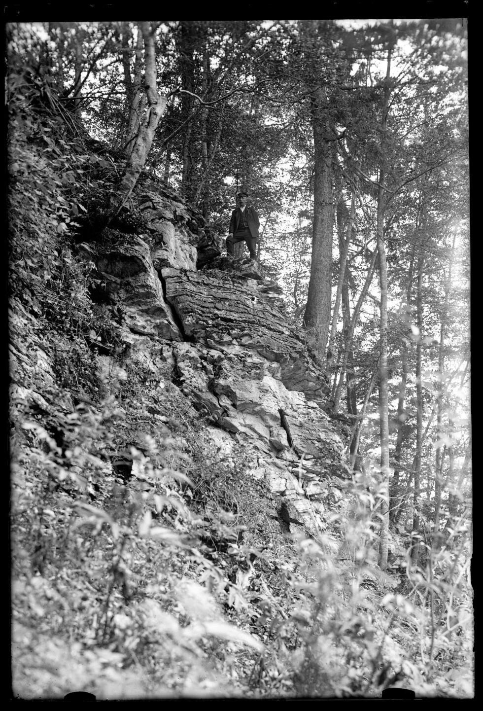 [Person in Uniform auf einem Felsvorsprung in steilem Gelände]