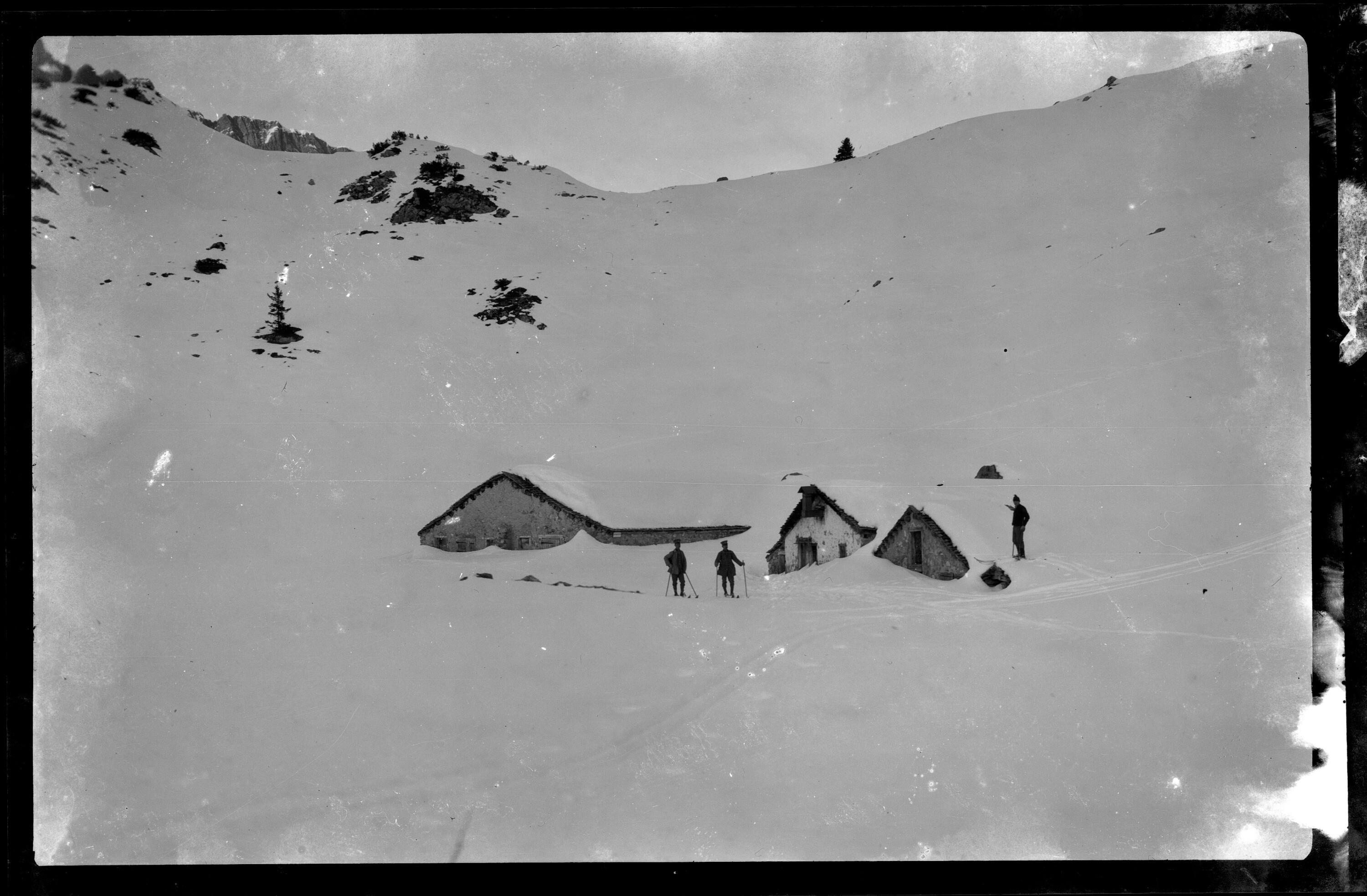 [Drei Skifahrer vor drei Almhütten]