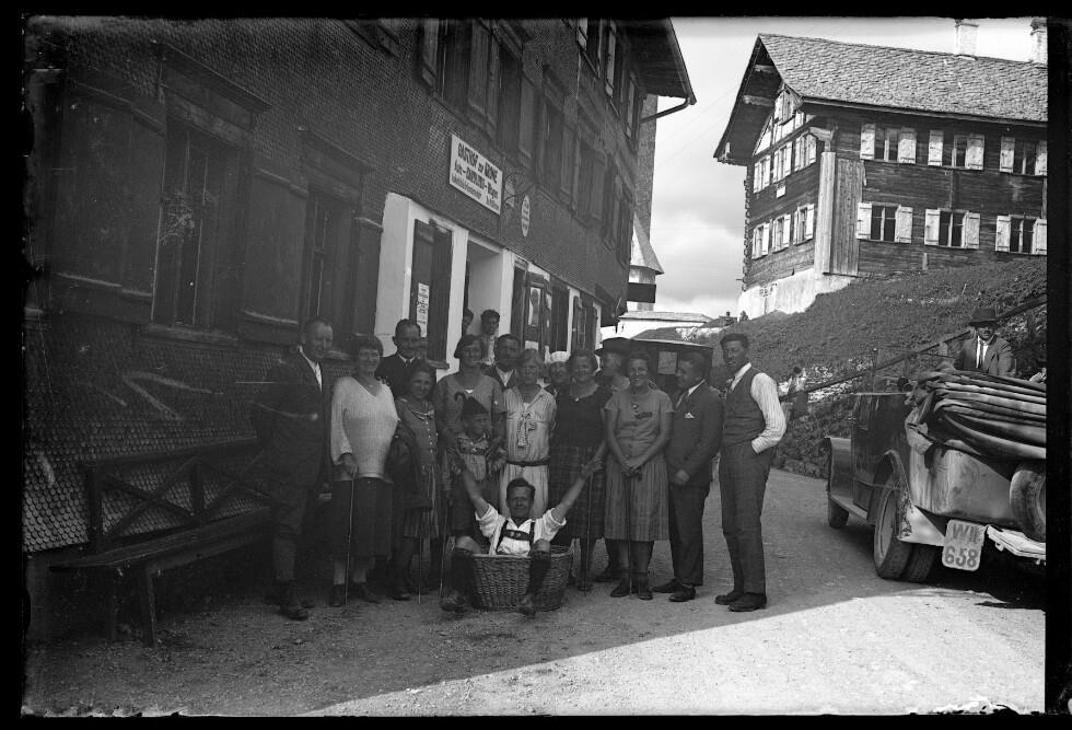 [Gruppenfoto mit Wilhelm Purtscher vor dem Gasthof Krone in Lech]