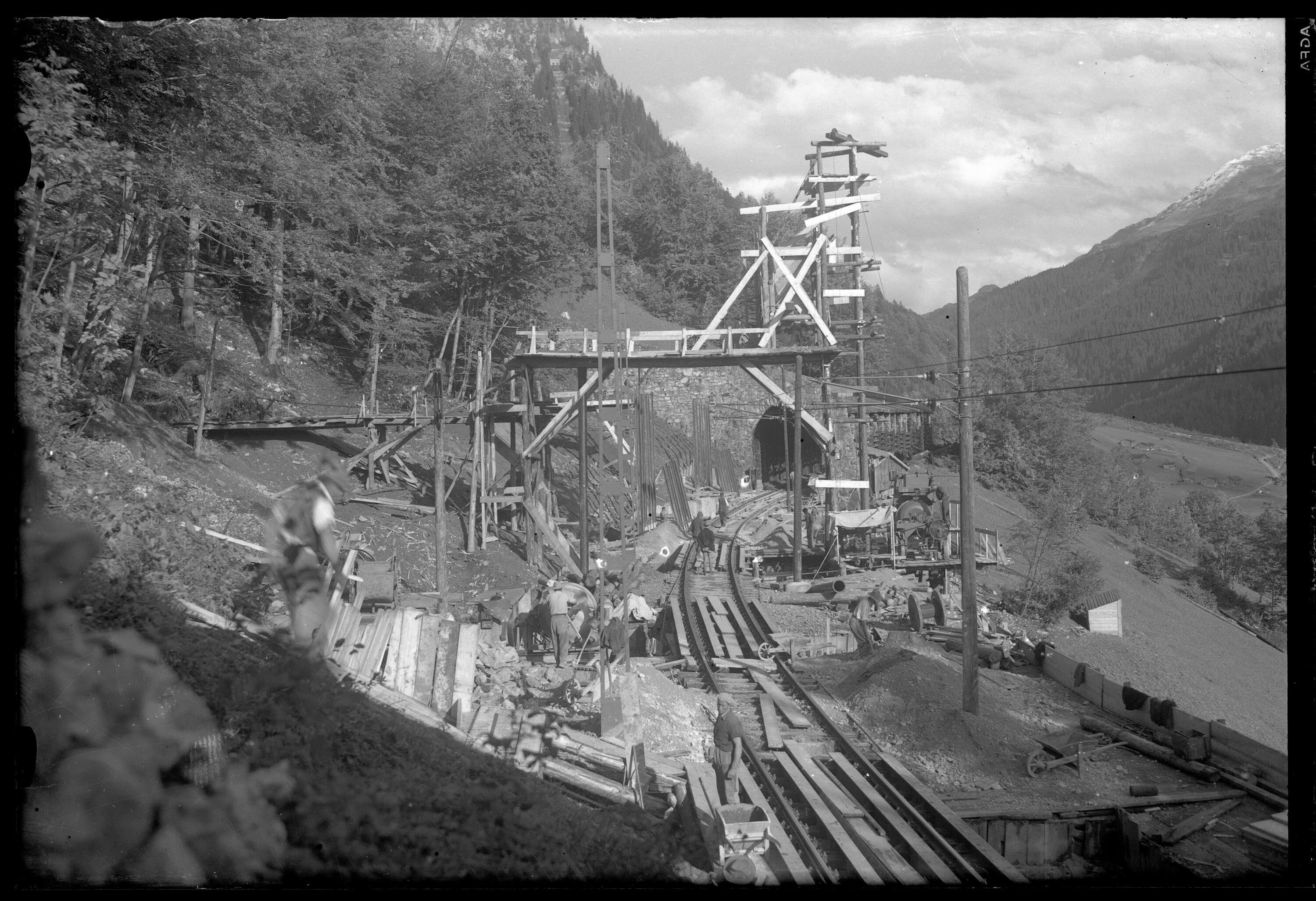 • Im Bildhintergrund ist das aus dem Jahre 1883 stammende Lawinenschutzdach zu erkennen. Über das ganze Bild verteilt sind mehrere Arbeiter zu sehen. Als ausführende Baufirma tritt Universale - Redlich & Berger (Wien) in Erscheinung. (Text: Michael Laublättner)