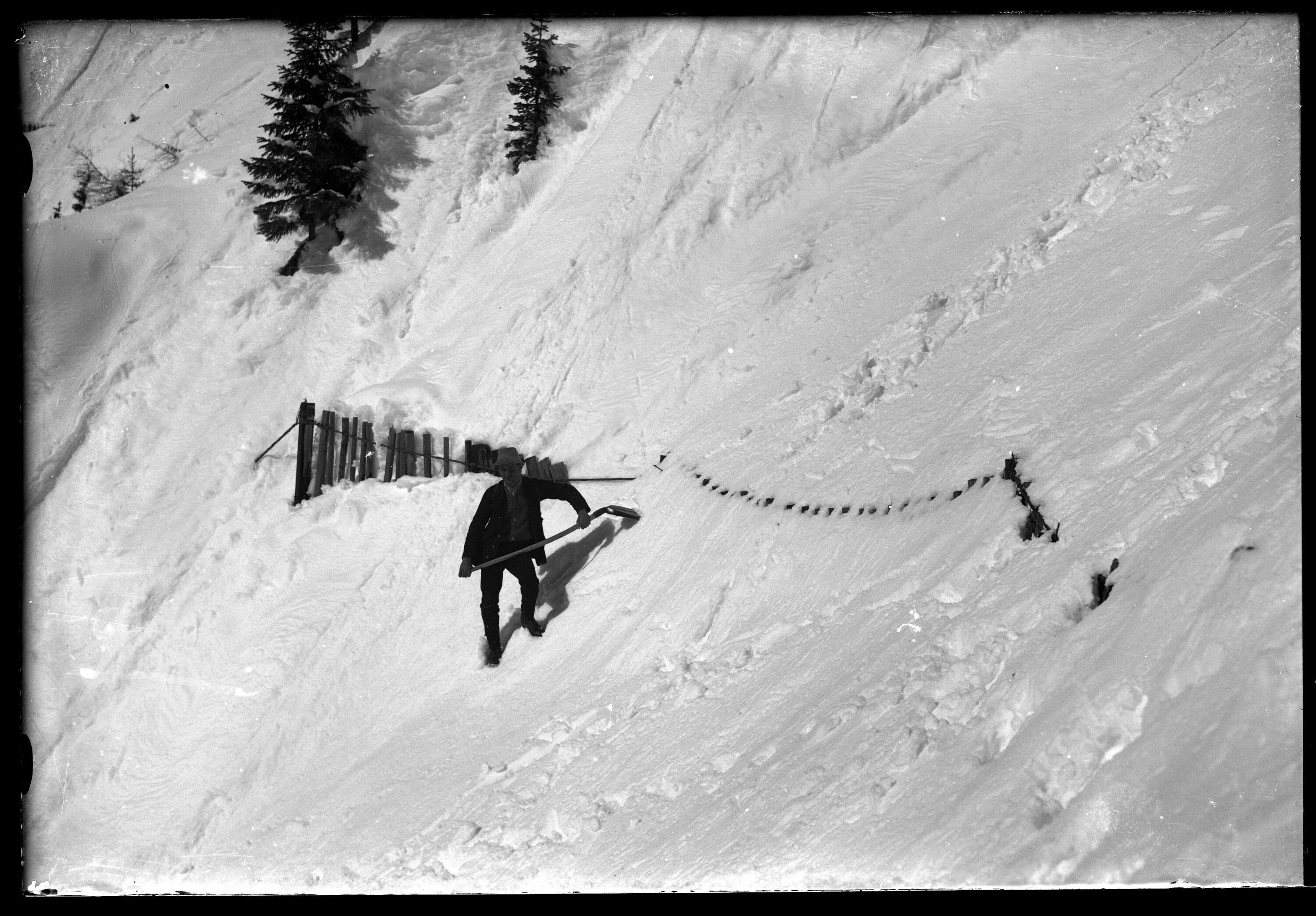 • In der Bildmitte ist eine Person mit einer Schneeschaufel zu sehen. (Text: Michael Laublättner)