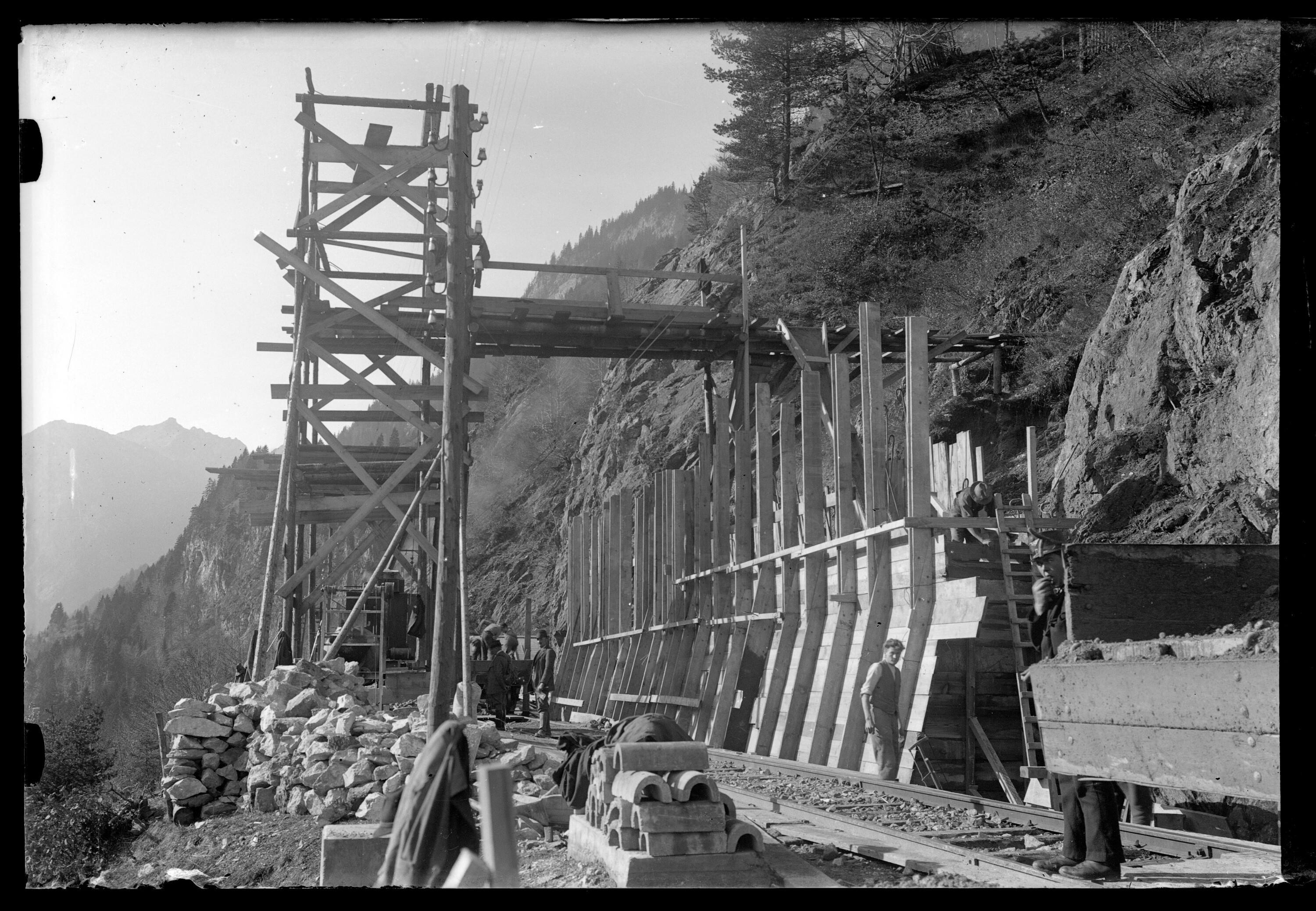 • Heute existiert von diesem Lawinendach nur noch die bergseitige Betonierung; Neben der Baustelleneinrichtung sind mehrere Arbeiter auf dem Bild zu erkennen. In die rechte Bildhälfte ragt das Ende eines Waggons. (Text: Michael Laublättner)